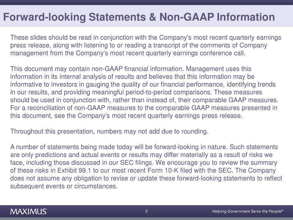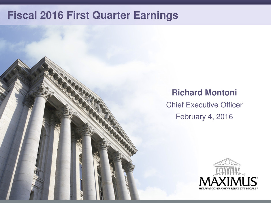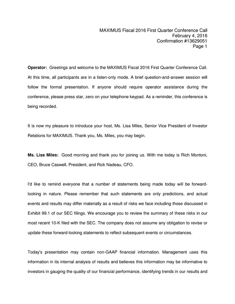 MAXIMUS Fiscal 2016 First Quarter Conference Call February 4, 2016 Confirmation #13629051 Page 1 Operator: Greetings and welcome to the MAXIMUS Fiscal 2016 First Quarter Conference Call. At this time, all participants are in a listen-only mode. A brief question-and-answer session will follow the formal presentation. If anyone should require operator assistance during the conference, please press star, zero on your telephone keypad. As a reminder, this conference is being recorded. It is now my pleasure to introduce your host, Ms. Lisa Miles, Senior Vice President of Investor Relations for MAXIMUS. Thank you, Ms. Miles, you may begin. Ms. Lisa Miles: Good morning and thank you for joining us. With me today is Rich Montoni, CEO, Bruce Caswell, President, and Rick Nadeau, CFO. I'd like to remind everyone that a number of statements being made today will be forward- looking in nature. Please remember that such statements are only predictions, and actual events and results may differ materially as a result of risks we face including those discussed in Exhibit 99.1 of our SEC filings. We encourage you to review the summary of these risks in our most recent 10-K filed with the SEC. The company does not assume any obligation to revise or update these forward-looking statements to reflect subsequent events or circumstances. Today's presentation may contain non-GAAP financial information. Management uses this information in its internal analysis of results and believes this information may be informative to investors in gauging the quality of our financial performance, identifying trends in our results and