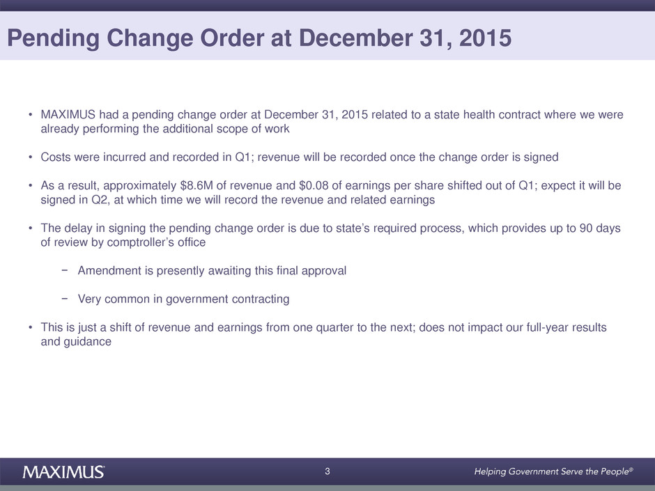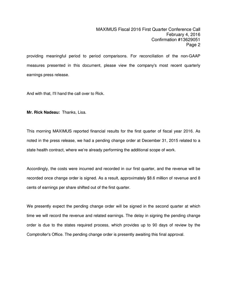 MAXIMUS Fiscal 2016 First Quarter Conference Call February 4, 2016 Confirmation #13629051 Page 2 providing meaningful period to period comparisons. For reconciliation of the non-GAAP measures presented in this document, please view the company's most recent quarterly earnings press release. And with that, I'll hand the call over to Rick. Mr. Rick Nadeau: Thanks, Lisa. This morning MAXIMUS reported financial results for the first quarter of fiscal year 2016. As noted in the press release, we had a pending change order at December 31, 2015 related to a state health contract, where we’re already performing the additional scope of work. Accordingly, the costs were incurred and recorded in our first quarter, and the revenue will be recorded once change order is signed. As a result, approximately $8.6 million of revenue and 8 cents of earnings per share shifted out of the first quarter. We presently expect the pending change order will be signed in the second quarter at which time we will record the revenue and related earnings. The delay in signing the pending change order is due to the states required process, which provides up to 90 days of review by the Comptroller's Office. The pending change order is presently awaiting this final approval.