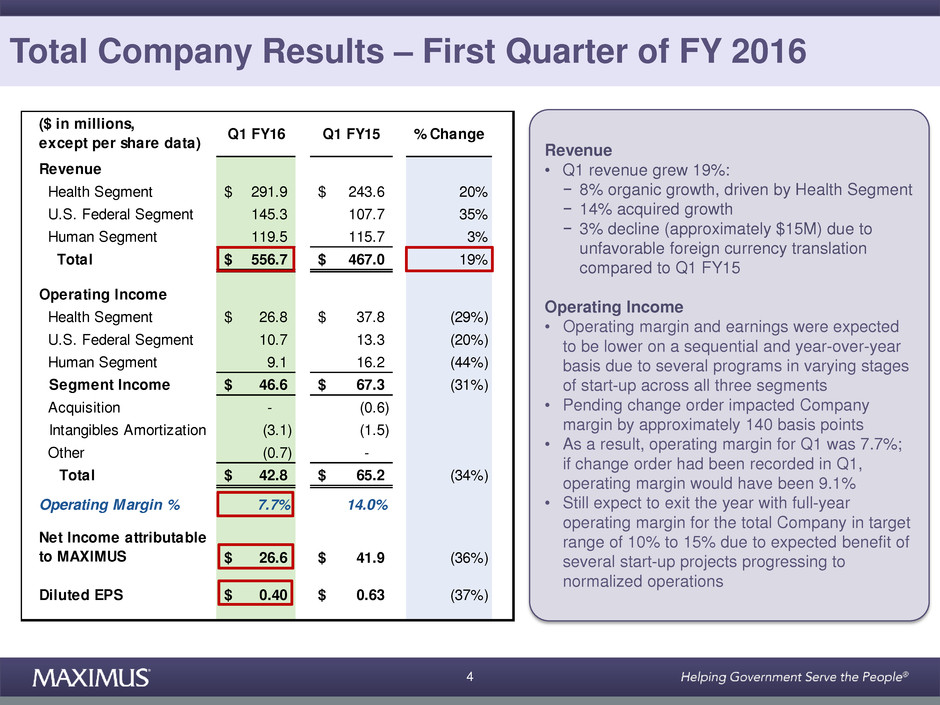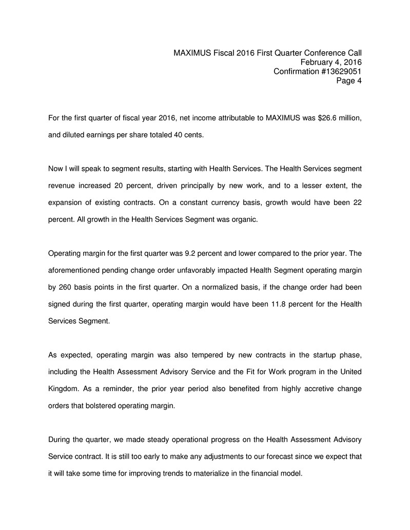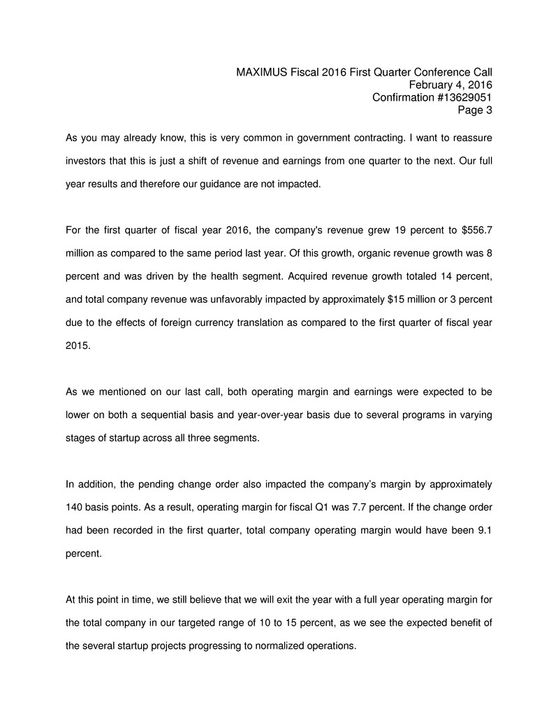 MAXIMUS Fiscal 2016 First Quarter Conference Call February 4, 2016 Confirmation #13629051 Page 3 As you may already know, this is very common in government contracting. I want to reassure investors that this is just a shift of revenue and earnings from one quarter to the next. Our full year results and therefore our guidance are not impacted. For the first quarter of fiscal year 2016, the company's revenue grew 19 percent to $556.7 million as compared to the same period last year. Of this growth, organic revenue growth was 8 percent and was driven by the health segment. Acquired revenue growth totaled 14 percent, and total company revenue was unfavorably impacted by approximately $15 million or 3 percent due to the effects of foreign currency translation as compared to the first quarter of fiscal year 2015. As we mentioned on our last call, both operating margin and earnings were expected to be lower on both a sequential basis and year-over-year basis due to several programs in varying stages of startup across all three segments. In addition, the pending change order also impacted the company’s margin by approximately 140 basis points. As a result, operating margin for fiscal Q1 was 7.7 percent. If the change order had been recorded in the first quarter, total company operating margin would have been 9.1 percent. At this point in time, we still believe that we will exit the year with a full year operating margin for the total company in our targeted range of 10 to 15 percent, as we see the expected benefit of the several startup projects progressing to normalized operations.