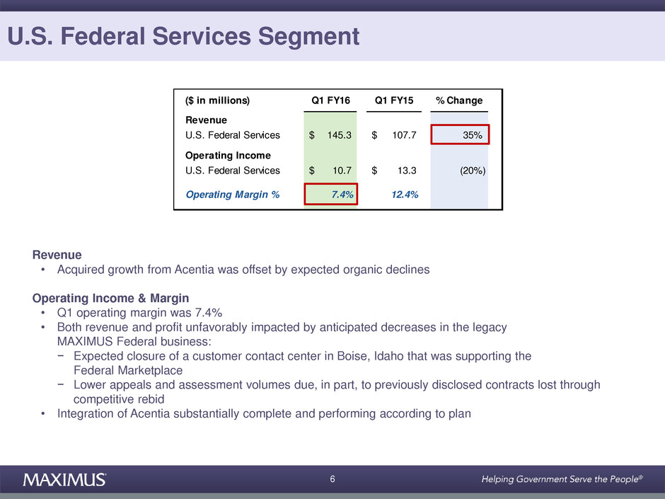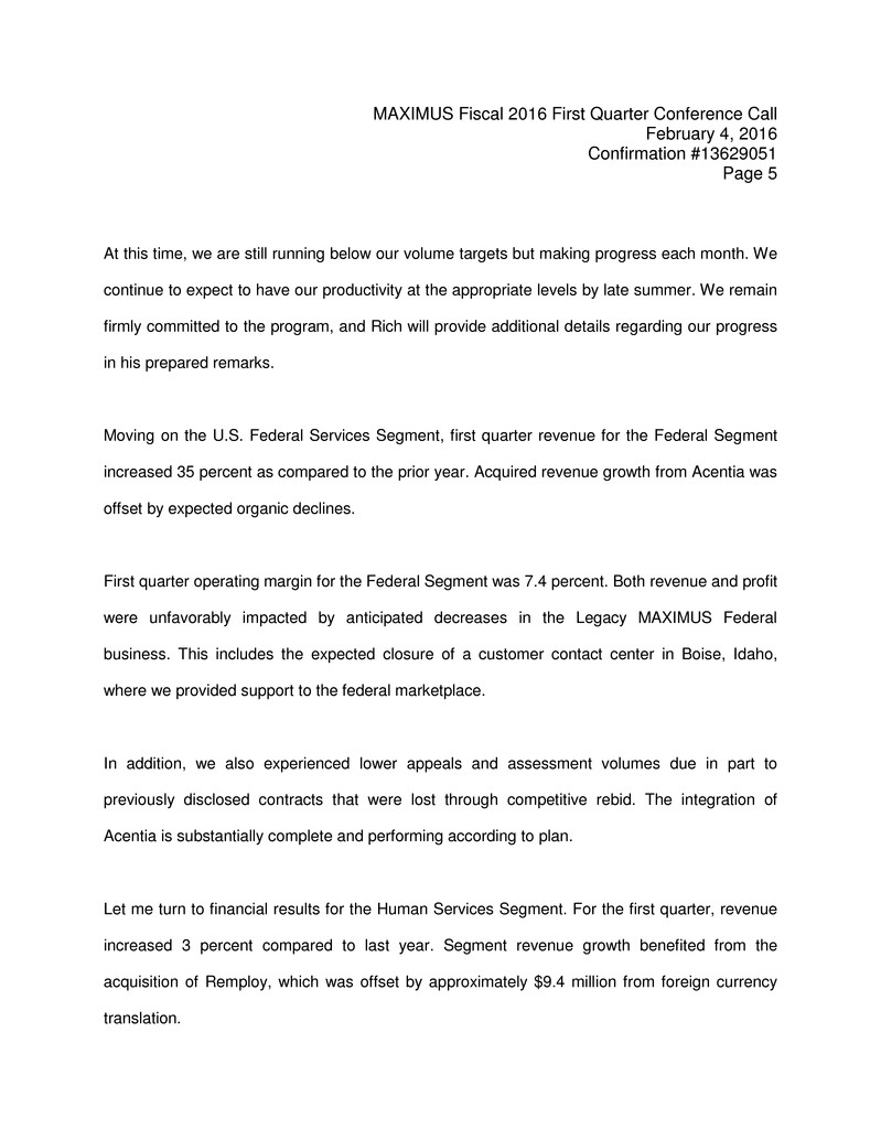 MAXIMUS Fiscal 2016 First Quarter Conference Call February 4, 2016 Confirmation #13629051 Page 5 At this time, we are still running below our volume targets but making progress each month. We continue to expect to have our productivity at the appropriate levels by late summer. We remain firmly committed to the program, and Rich will provide additional details regarding our progress in his prepared remarks. Moving on the U.S. Federal Services Segment, first quarter revenue for the Federal Segment increased 35 percent as compared to the prior year. Acquired revenue growth from Acentia was offset by expected organic declines. First quarter operating margin for the Federal Segment was 7.4 percent. Both revenue and profit were unfavorably impacted by anticipated decreases in the Legacy MAXIMUS Federal business. This includes the expected closure of a customer contact center in Boise, Idaho, where we provided support to the federal marketplace. In addition, we also experienced lower appeals and assessment volumes due in part to previously disclosed contracts that were lost through competitive rebid. The integration of Acentia is substantially complete and performing according to plan. Let me turn to financial results for the Human Services Segment. For the first quarter, revenue increased 3 percent compared to last year. Segment revenue growth benefited from the acquisition of Remploy, which was offset by approximately $9.4 million from foreign currency translation.