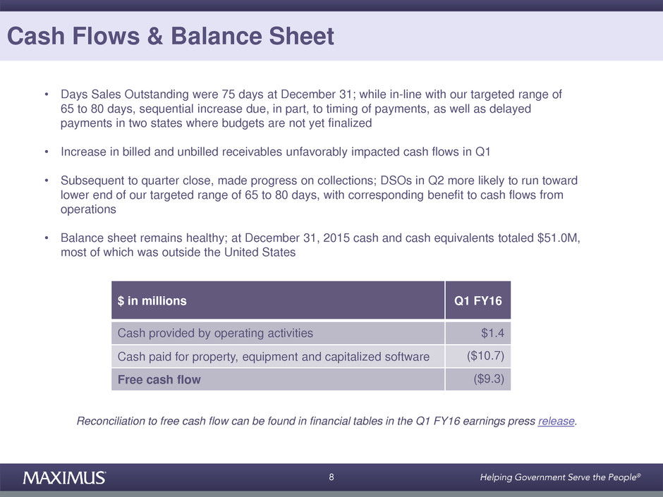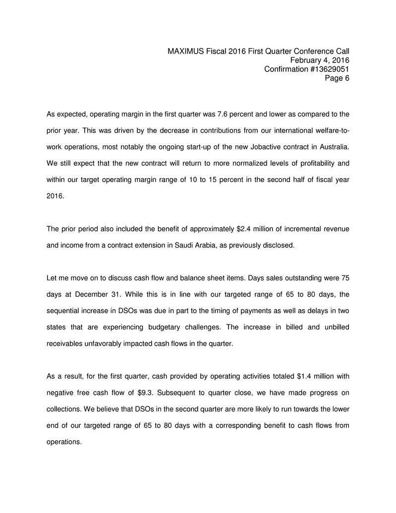MAXIMUS Fiscal 2016 First Quarter Conference Call February 4, 2016 Confirmation #13629051 Page 6 As expected, operating margin in the first quarter was 7.6 percent and lower as compared to the prior year. This was driven by the decrease in contributions from our international welfare-to- work operations, most notably the ongoing start-up of the new Jobactive contract in Australia. We still expect that the new contract will return to more normalized levels of profitability and within our target operating margin range of 10 to 15 percent in the second half of fiscal year 2016. The prior period also included the benefit of approximately $2.4 million of incremental revenue and income from a contract extension in Saudi Arabia, as previously disclosed. Let me move on to discuss cash flow and balance sheet items. Days sales outstanding were 75 days at December 31. While this is in line with our targeted range of 65 to 80 days, the sequential increase in DSOs was due in part to the timing of payments as well as delays in two states that are experiencing budgetary challenges. The increase in billed and unbilled receivables unfavorably impacted cash flows in the quarter. As a result, for the first quarter, cash provided by operating activities totaled $1.4 million with negative free cash flow of $9.3. Subsequent to quarter close, we have made progress on collections. We believe that DSOs in the second quarter are more likely to run towards the lower end of our targeted range of 65 to 80 days with a corresponding benefit to cash flows from operations.