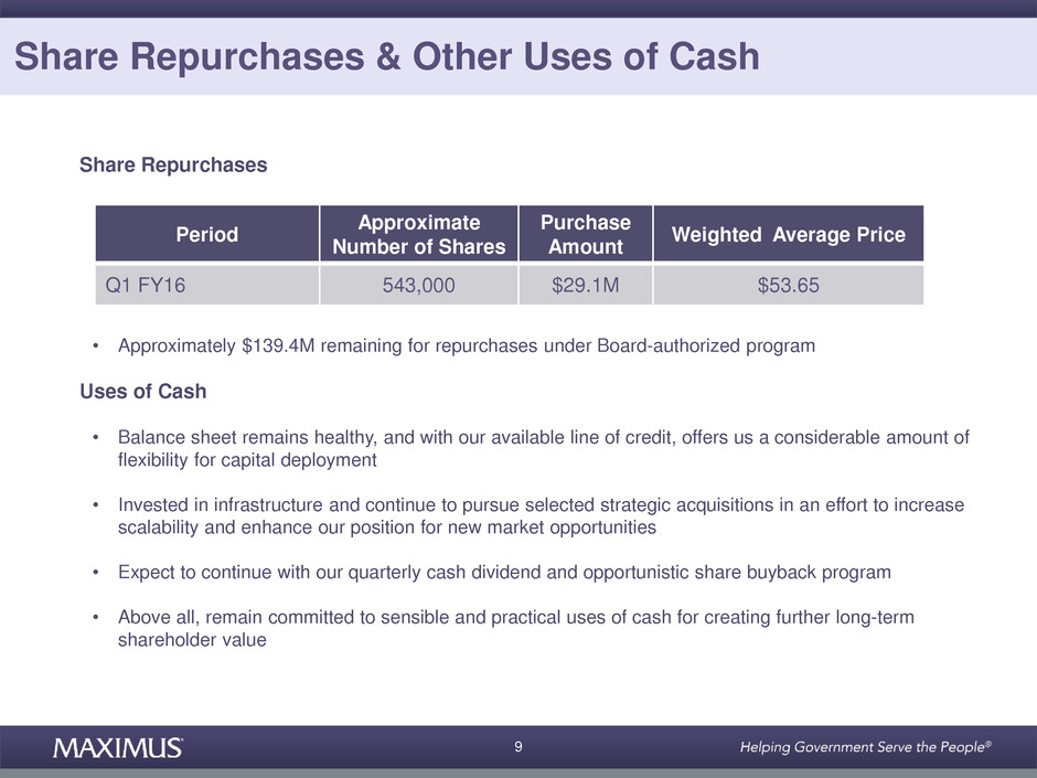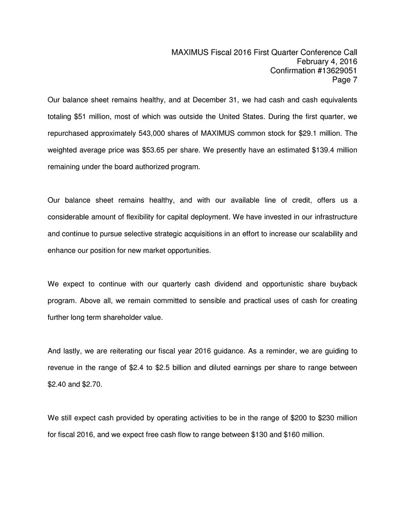 MAXIMUS Fiscal 2016 First Quarter Conference Call February 4, 2016 Confirmation #13629051 Page 7 Our balance sheet remains healthy, and at December 31, we had cash and cash equivalents totaling $51 million, most of which was outside the United States. During the first quarter, we repurchased approximately 543,000 shares of MAXIMUS common stock for $29.1 million. The weighted average price was $53.65 per share. We presently have an estimated $139.4 million remaining under the board authorized program. Our balance sheet remains healthy, and with our available line of credit, offers us a considerable amount of flexibility for capital deployment. We have invested in our infrastructure and continue to pursue selective strategic acquisitions in an effort to increase our scalability and enhance our position for new market opportunities. We expect to continue with our quarterly cash dividend and opportunistic share buyback program. Above all, we remain committed to sensible and practical uses of cash for creating further long term shareholder value. And lastly, we are reiterating our fiscal year 2016 guidance. As a reminder, we are guiding to revenue in the range of $2.4 to $2.5 billion and diluted earnings per share to range between $2.40 and $2.70. We still expect cash provided by operating activities to be in the range of $200 to $230 million for fiscal 2016, and we expect free cash flow to range between $130 and $160 million.