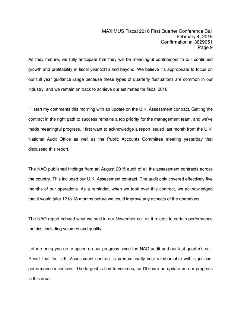 MAXIMUS Fiscal 2016 First Quarter Conference Call February 4, 2016 Confirmation #13629051 Page 9 As they mature, we fully anticipate that they will be meaningful contributors to our continued growth and profitability in fiscal year 2016 and beyond. We believe it’s appropriate to focus on our full year guidance range because these types of quarterly fluctuations are common in our industry, and we remain on track to achieve our estimates for fiscal 2016. I’ll start my comments this morning with an update on the U.K. Assessment contract. Getting the contract in the right path to success remains a top priority for the management team, and we’ve made meaningful progress. I first want to acknowledge a report issued last month from the U.K. National Audit Office as well as the Public Accounts Committee meeting yesterday that discussed this report. The NAO published findings from an August 2015 audit of all the assessment contracts across the country. This included our U.K. Assessment contract. The audit only covered effectively five months of our operations. As a reminder, when we took over this contract, we acknowledged that it would take 12 to 18 months before we could improve any aspects of the operations. The NAO report echoed what we said in our November call as it relates to certain performance metrics, including volumes and quality. Let me bring you up to speed on our progress since the NAO audit and our last quarter’s call. Recall that the U.K. Assessment contract is predominantly cost reimbursable with significant performance incentives. The largest is tied to volumes, so I’ll share an update on our progress in this area.