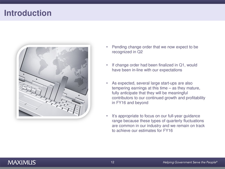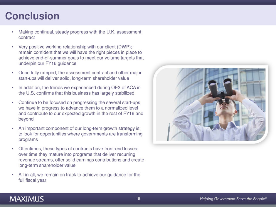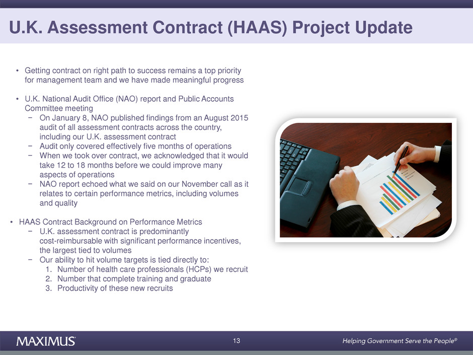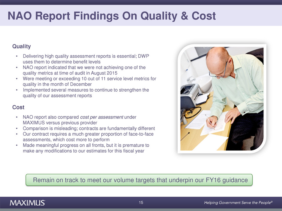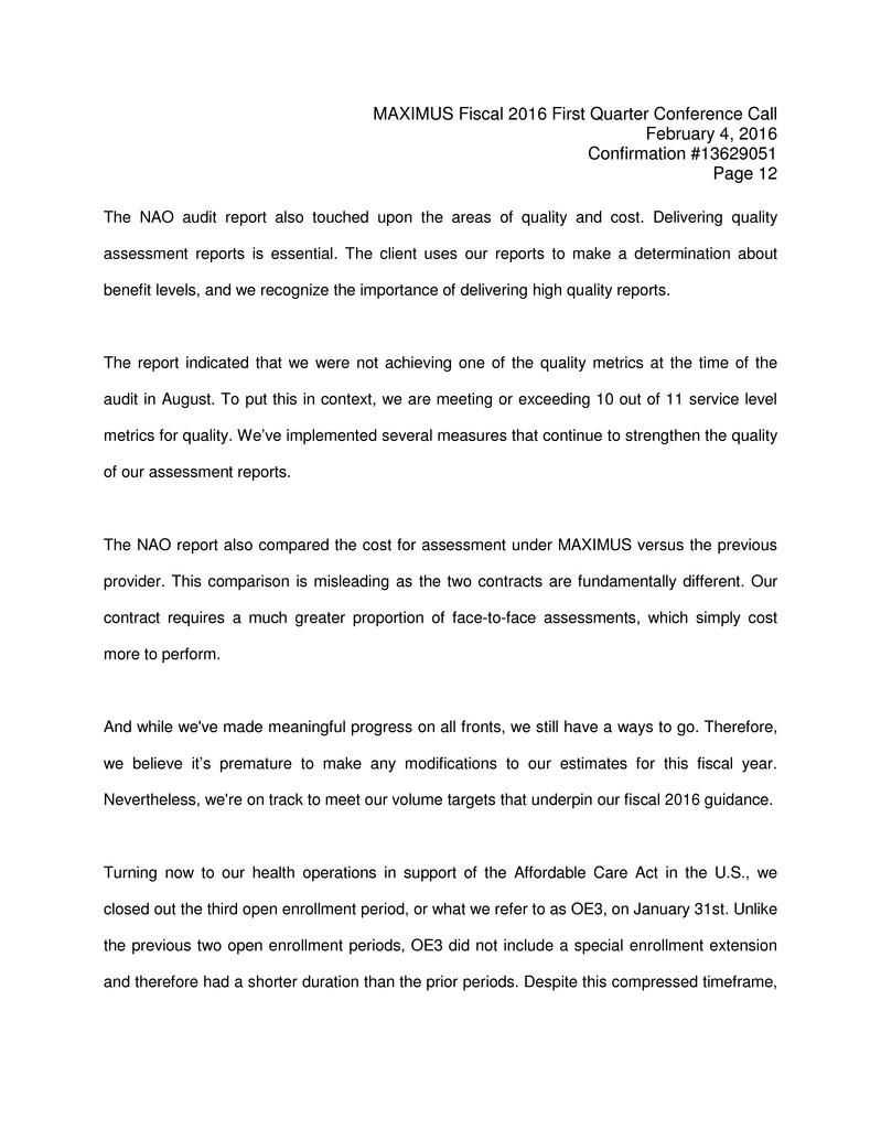 MAXIMUS Fiscal 2016 First Quarter Conference Call February 4, 2016 Confirmation #13629051 Page 12 The NAO audit report also touched upon the areas of quality and cost. Delivering quality assessment reports is essential. The client uses our reports to make a determination about benefit levels, and we recognize the importance of delivering high quality reports. The report indicated that we were not achieving one of the quality metrics at the time of the audit in August. To put this in context, we are meeting or exceeding 10 out of 11 service level metrics for quality. We’ve implemented several measures that continue to strengthen the quality of our assessment reports. The NAO report also compared the cost for assessment under MAXIMUS versus the previous provider. This comparison is misleading as the two contracts are fundamentally different. Our contract requires a much greater proportion of face-to-face assessments, which simply cost more to perform. And while we've made meaningful progress on all fronts, we still have a ways to go. Therefore, we believe it’s premature to make any modifications to our estimates for this fiscal year. Nevertheless, we're on track to meet our volume targets that underpin our fiscal 2016 guidance. Turning now to our health operations in support of the Affordable Care Act in the U.S., we closed out the third open enrollment period, or what we refer to as OE3, on January 31st. Unlike the previous two open enrollment periods, OE3 did not include a special enrollment extension and therefore had a shorter duration than the prior periods. Despite this compressed timeframe,