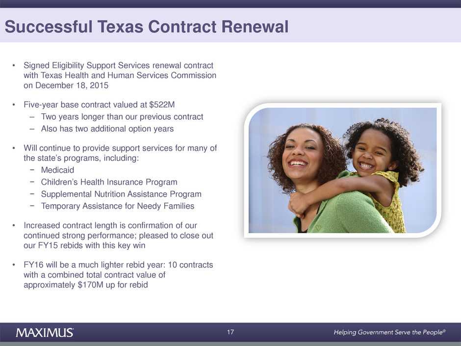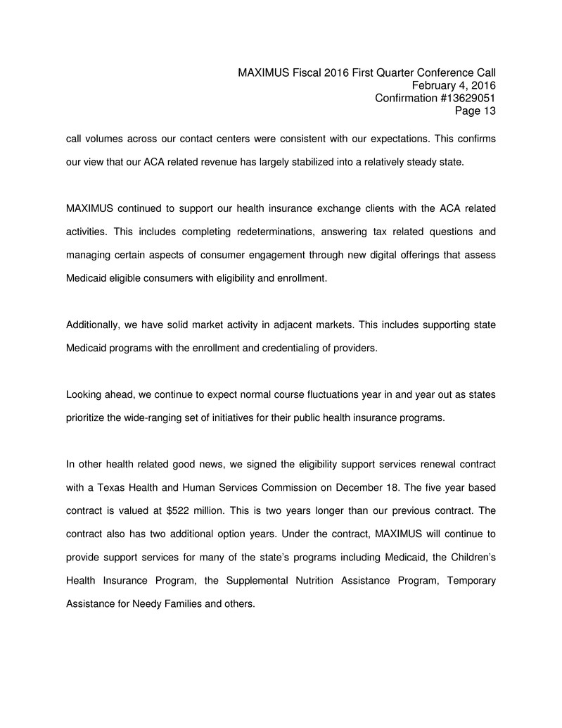 MAXIMUS Fiscal 2016 First Quarter Conference Call February 4, 2016 Confirmation #13629051 Page 13 call volumes across our contact centers were consistent with our expectations. This confirms our view that our ACA related revenue has largely stabilized into a relatively steady state. MAXIMUS continued to support our health insurance exchange clients with the ACA related activities. This includes completing redeterminations, answering tax related questions and managing certain aspects of consumer engagement through new digital offerings that assess Medicaid eligible consumers with eligibility and enrollment. Additionally, we have solid market activity in adjacent markets. This includes supporting state Medicaid programs with the enrollment and credentialing of providers. Looking ahead, we continue to expect normal course fluctuations year in and year out as states prioritize the wide-ranging set of initiatives for their public health insurance programs. In other health related good news, we signed the eligibility support services renewal contract with a Texas Health and Human Services Commission on December 18. The five year based contract is valued at $522 million. This is two years longer than our previous contract. The contract also has two additional option years. Under the contract, MAXIMUS will continue to provide support services for many of the state’s programs including Medicaid, the Children’s Health Insurance Program, the Supplemental Nutrition Assistance Program, Temporary Assistance for Needy Families and others.