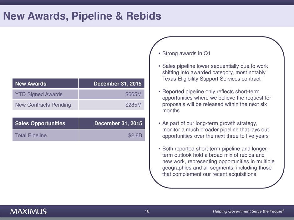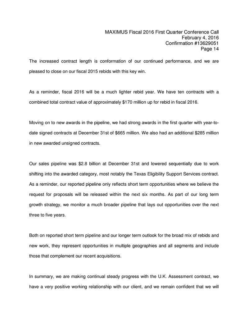 MAXIMUS Fiscal 2016 First Quarter Conference Call February 4, 2016 Confirmation #13629051 Page 14 The increased contract length is conformation of our continued performance, and we are pleased to close on our fiscal 2015 rebids with this key win. As a reminder, fiscal 2016 will be a much lighter rebid year. We have ten contracts with a combined total contract value of approximately $170 million up for rebid in fiscal 2016. Moving on to new awards in the pipeline, we had strong awards in the first quarter with year-to- date signed contracts at December 31st of $665 million. We also had an additional $285 million in new awarded unsigned contracts. Our sales pipeline was $2.8 billion at December 31st and lowered sequentially due to work shifting into the awarded category, most notably the Texas Eligibility Support Services contract. As a reminder, our reported pipeline only reflects short term opportunities where we believe the request for proposals will be released within the next six months. As part of our long term growth strategy, we monitor a much broader pipeline that lays out opportunities over the next three to five years. Both on reported short term pipeline and our longer term outlook for the broad mix of rebids and new work, they represent opportunities in multiple geographies and all segments and include those that complement our recent acquisitions. In summary, we are making continual steady progress with the U.K. Assessment contract, we have a very positive working relationship with our client, and we remain confident that we will