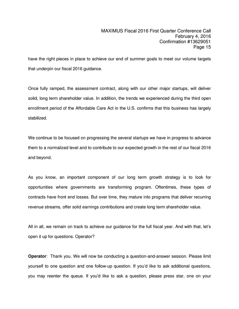 MAXIMUS Fiscal 2016 First Quarter Conference Call February 4, 2016 Confirmation #13629051 Page 15 have the right pieces in place to achieve our end of summer goals to meet our volume targets that underpin our fiscal 2016 guidance. Once fully ramped, the assessment contract, along with our other major startups, will deliver solid, long term shareholder value. In addition, the trends we experienced during the third open enrollment period of the Affordable Care Act in the U.S. confirms that this business has largely stabilized. We continue to be focused on progressing the several startups we have in progress to advance them to a normalized level and to contribute to our expected growth in the rest of our fiscal 2016 and beyond. As you know, an important component of our long term growth strategy is to look for opportunities where governments are transforming program. Oftentimes, these types of contracts have front end losses. But over time, they mature into programs that deliver recurring revenue streams, offer solid earnings contributions and create long term shareholder value. All in all, we remain on track to achieve our guidance for the full fiscal year. And with that, let’s open it up for questions. Operator? Operator: Thank you. We will now be conducting a question-and-answer session. Please limit yourself to one question and one follow-up question. If you’d like to ask additional questions, you may reenter the queue. If you'd like to ask a question, please press star, one on your