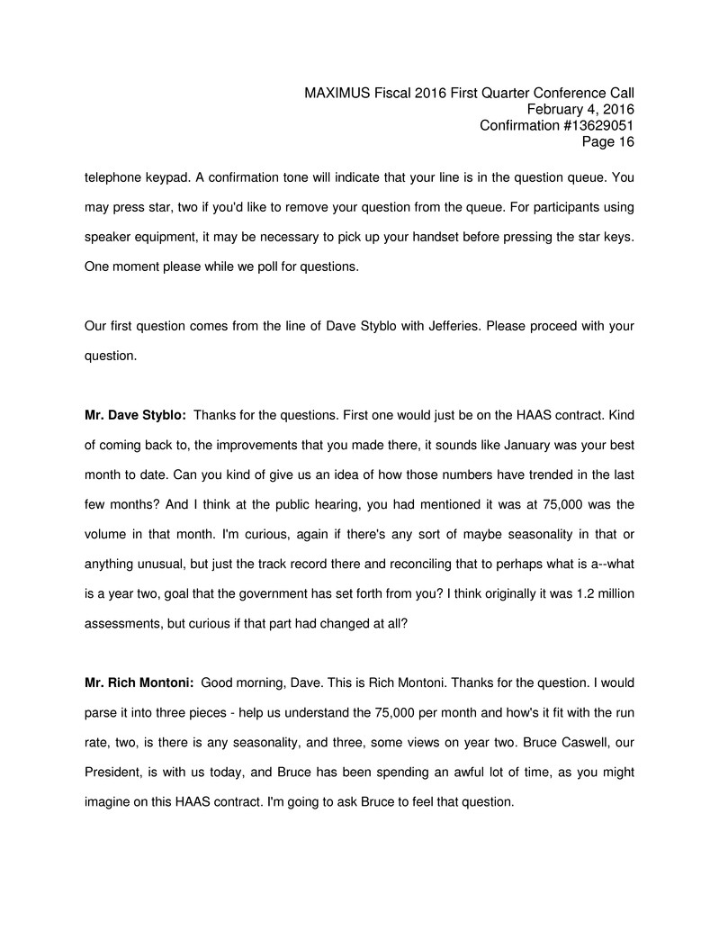 MAXIMUS Fiscal 2016 First Quarter Conference Call February 4, 2016 Confirmation #13629051 Page 16 telephone keypad. A confirmation tone will indicate that your line is in the question queue. You may press star, two if you'd like to remove your question from the queue. For participants using speaker equipment, it may be necessary to pick up your handset before pressing the star keys. One moment please while we poll for questions. Our first question comes from the line of Dave Styblo with Jefferies. Please proceed with your question. Mr. Dave Styblo: Thanks for the questions. First one would just be on the HAAS contract. Kind of coming back to, the improvements that you made there, it sounds like January was your best month to date. Can you kind of give us an idea of how those numbers have trended in the last few months? And I think at the public hearing, you had mentioned it was at 75,000 was the volume in that month. I'm curious, again if there's any sort of maybe seasonality in that or anything unusual, but just the track record there and reconciling that to perhaps what is a--what is a year two, goal that the government has set forth from you? I think originally it was 1.2 million assessments, but curious if that part had changed at all? Mr. Rich Montoni: Good morning, Dave. This is Rich Montoni. Thanks for the question. I would parse it into three pieces - help us understand the 75,000 per month and how's it fit with the run rate, two, is there is any seasonality, and three, some views on year two. Bruce Caswell, our President, is with us today, and Bruce has been spending an awful lot of time, as you might imagine on this HAAS contract. I'm going to ask Bruce to feel that question.