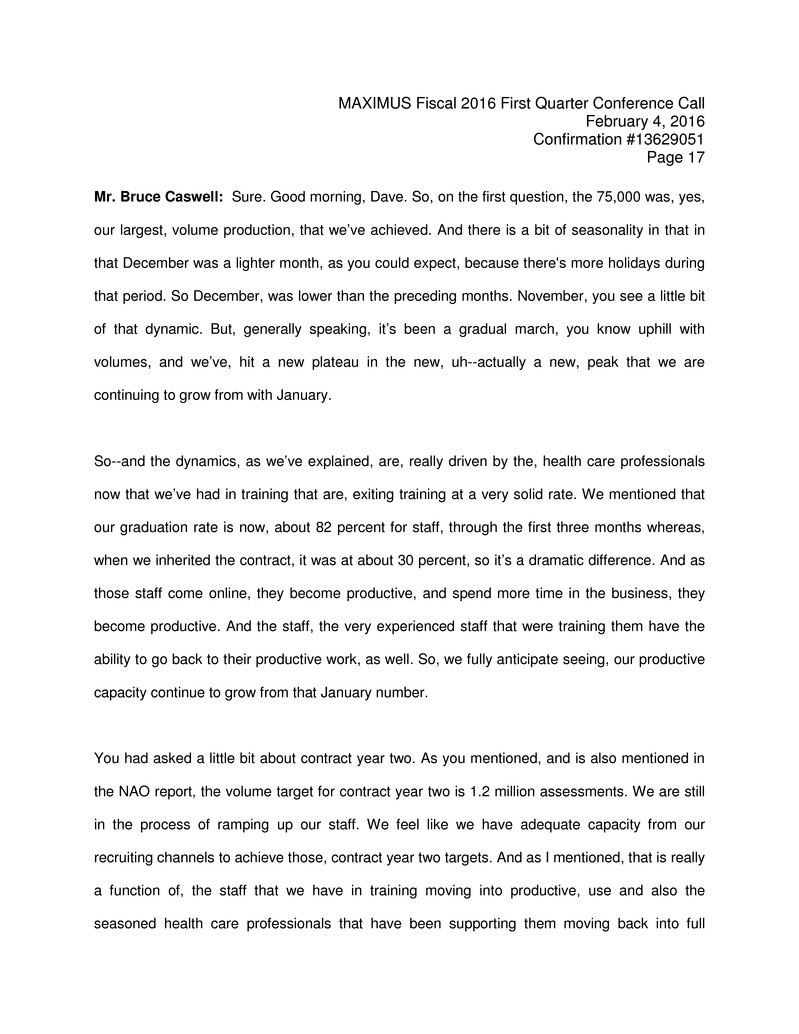 MAXIMUS Fiscal 2016 First Quarter Conference Call February 4, 2016 Confirmation #13629051 Page 17 Mr. Bruce Caswell: Sure. Good morning, Dave. So, on the first question, the 75,000 was, yes, our largest, volume production, that we’ve achieved. And there is a bit of seasonality in that in that December was a lighter month, as you could expect, because there's more holidays during that period. So December, was lower than the preceding months. November, you see a little bit of that dynamic. But, generally speaking, it’s been a gradual march, you know uphill with volumes, and we’ve, hit a new plateau in the new, uh--actually a new, peak that we are continuing to grow from with January. So--and the dynamics, as we’ve explained, are, really driven by the, health care professionals now that we’ve had in training that are, exiting training at a very solid rate. We mentioned that our graduation rate is now, about 82 percent for staff, through the first three months whereas, when we inherited the contract, it was at about 30 percent, so it’s a dramatic difference. And as those staff come online, they become productive, and spend more time in the business, they become productive. And the staff, the very experienced staff that were training them have the ability to go back to their productive work, as well. So, we fully anticipate seeing, our productive capacity continue to grow from that January number. You had asked a little bit about contract year two. As you mentioned, and is also mentioned in the NAO report, the volume target for contract year two is 1.2 million assessments. We are still in the process of ramping up our staff. We feel like we have adequate capacity from our recruiting channels to achieve those, contract year two targets. And as I mentioned, that is really a function of, the staff that we have in training moving into productive, use and also the seasoned health care professionals that have been supporting them moving back into full