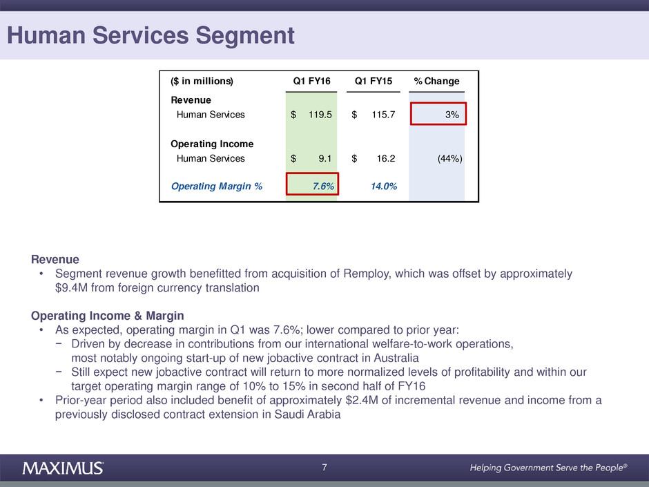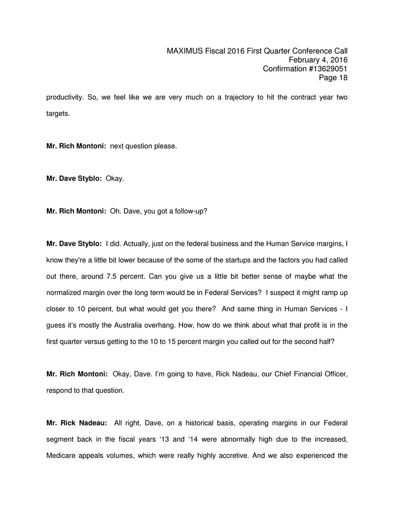 MAXIMUS Fiscal 2016 First Quarter Conference Call February 4, 2016 Confirmation #13629051 Page 18 productivity. So, we feel like we are very much on a trajectory to hit the contract year two targets. Mr. Rich Montoni: next question please. Mr. Dave Styblo: Okay. Mr. Rich Montoni: Oh. Dave, you got a follow-up? Mr. Dave Styblo: I did. Actually, just on the federal business and the Human Service margins, I know they're a little bit lower because of the some of the startups and the factors you had called out there, around 7.5 percent. Can you give us a little bit better sense of maybe what the normalized margin over the long term would be in Federal Services? I suspect it might ramp up closer to 10 percent, but what would get you there? And same thing in Human Services - I guess it’s mostly the Australia overhang. How, how do we think about what that profit is in the first quarter versus getting to the 10 to 15 percent margin you called out for the second half? Mr. Rich Montoni: Okay, Dave. I’m going to have, Rick Nadeau, our Chief Financial Officer, respond to that question. Mr. Rick Nadeau: All right, Dave, on a historical basis, operating margins in our Federal segment back in the fiscal years ‘13 and ‘14 were abnormally high due to the increased, Medicare appeals volumes, which were really highly accretive. And we also experienced the