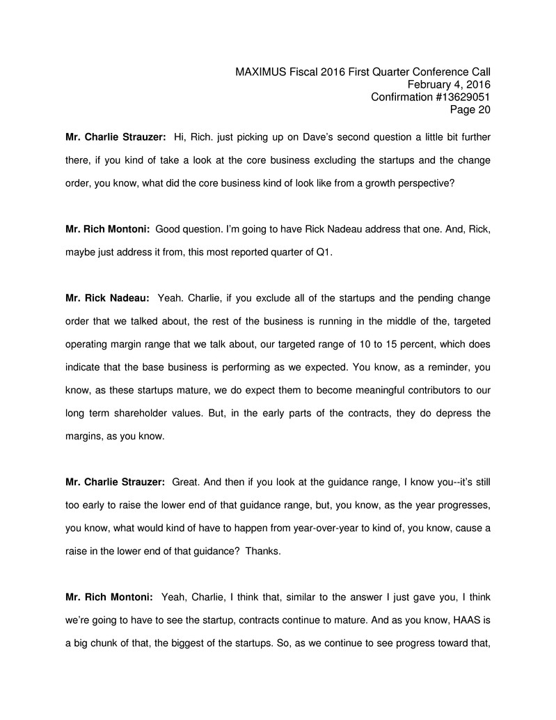 MAXIMUS Fiscal 2016 First Quarter Conference Call February 4, 2016 Confirmation #13629051 Page 20 Mr. Charlie Strauzer: Hi, Rich. just picking up on Dave’s second question a little bit further there, if you kind of take a look at the core business excluding the startups and the change order, you know, what did the core business kind of look like from a growth perspective? Mr. Rich Montoni: Good question. I’m going to have Rick Nadeau address that one. And, Rick, maybe just address it from, this most reported quarter of Q1. Mr. Rick Nadeau: Yeah. Charlie, if you exclude all of the startups and the pending change order that we talked about, the rest of the business is running in the middle of the, targeted operating margin range that we talk about, our targeted range of 10 to 15 percent, which does indicate that the base business is performing as we expected. You know, as a reminder, you know, as these startups mature, we do expect them to become meaningful contributors to our long term shareholder values. But, in the early parts of the contracts, they do depress the margins, as you know. Mr. Charlie Strauzer: Great. And then if you look at the guidance range, I know you--it’s still too early to raise the lower end of that guidance range, but, you know, as the year progresses, you know, what would kind of have to happen from year-over-year to kind of, you know, cause a raise in the lower end of that guidance? Thanks. Mr. Rich Montoni: Yeah, Charlie, I think that, similar to the answer I just gave you, I think we’re going to have to see the startup, contracts continue to mature. And as you know, HAAS is a big chunk of that, the biggest of the startups. So, as we continue to see progress toward that,