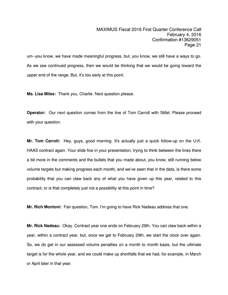 MAXIMUS Fiscal 2016 First Quarter Conference Call February 4, 2016 Confirmation #13629051 Page 21 um--you know, we have made meaningful progress, but, you know, we still have a ways to go. As we see continued progress, then we would be thinking that we would be going toward the upper end of the range. But, it’s too early at this point. Ms. Lisa Miles: Thank you, Charlie. Next question please. Operator: Our next question comes from the line of Tom Carroll with Stifel. Please proceed with your question. Mr. Tom Carroll: Hey, guys, good morning. It's actually just a quick follow-up on the U.K. HAAS contract again. Your slide five in your presentation, trying to think between the lines there a bit more in the comments and the bullets that you made about, you know, still running below volume targets but making progress each month, and we’ve seen that in the data, is there some probability that you can claw back any of what you have given up this year, related to this contract, or is that completely just not a possibility at this point in time? Mr. Rich Montoni: Fair question, Tom. I’m going to have Rick Nadeau address that one. Mr. Rick Nadeau: Okay. Contract year one ends on February 29th. You can claw back within a year, within a contract year, but, once we get to February 29th, we start the clock over again. So, we do get in our assessed volume penalties on a month to month basis, but the ultimate target is for the whole year, and we could make up shortfalls that we had, for example, in March or April later in that year.
