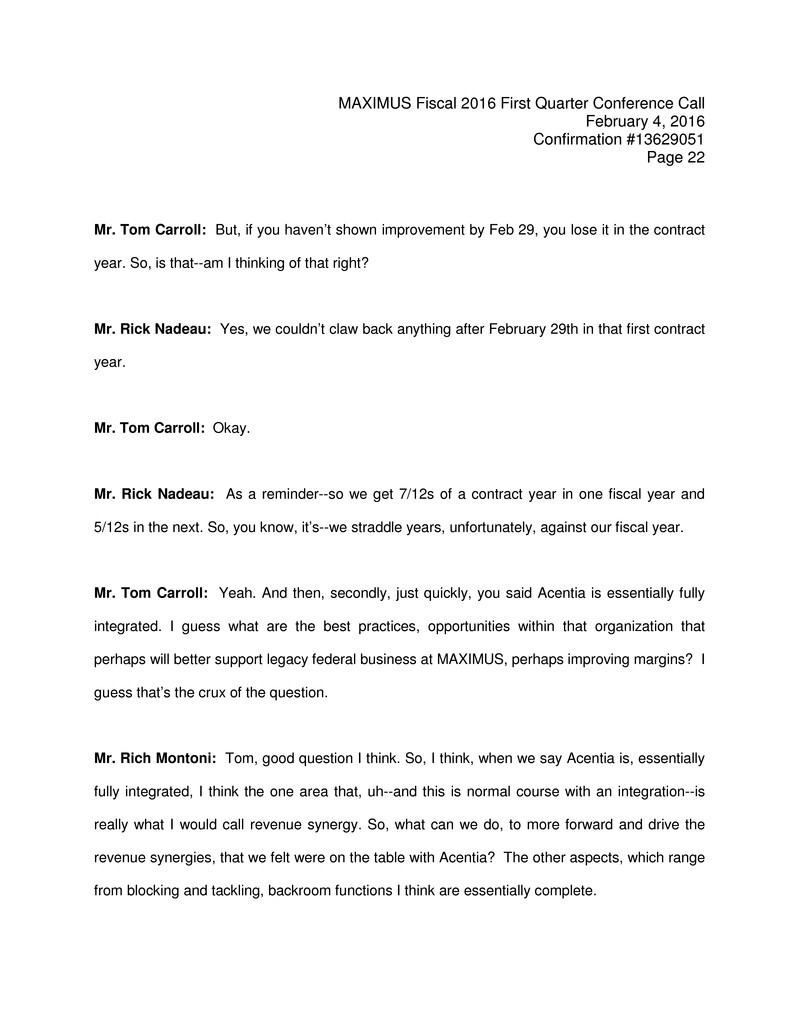 MAXIMUS Fiscal 2016 First Quarter Conference Call February 4, 2016 Confirmation #13629051 Page 22 Mr. Tom Carroll: But, if you haven’t shown improvement by Feb 29, you lose it in the contract year. So, is that--am I thinking of that right? Mr. Rick Nadeau: Yes, we couldn’t claw back anything after February 29th in that first contract year. Mr. Tom Carroll: Okay. Mr. Rick Nadeau: As a reminder--so we get 7/12s of a contract year in one fiscal year and 5/12s in the next. So, you know, it’s--we straddle years, unfortunately, against our fiscal year. Mr. Tom Carroll: Yeah. And then, secondly, just quickly, you said Acentia is essentially fully integrated. I guess what are the best practices, opportunities within that organization that perhaps will better support legacy federal business at MAXIMUS, perhaps improving margins? I guess that’s the crux of the question. Mr. Rich Montoni: Tom, good question I think. So, I think, when we say Acentia is, essentially fully integrated, I think the one area that, uh--and this is normal course with an integration--is really what I would call revenue synergy. So, what can we do, to more forward and drive the revenue synergies, that we felt were on the table with Acentia? The other aspects, which range from blocking and tackling, backroom functions I think are essentially complete.