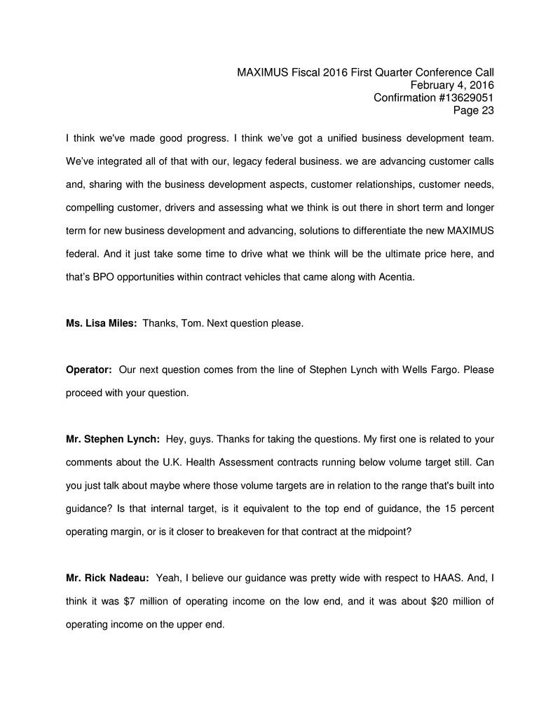 MAXIMUS Fiscal 2016 First Quarter Conference Call February 4, 2016 Confirmation #13629051 Page 23 I think we've made good progress. I think we’ve got a unified business development team. We’ve integrated all of that with our, legacy federal business. we are advancing customer calls and, sharing with the business development aspects, customer relationships, customer needs, compelling customer, drivers and assessing what we think is out there in short term and longer term for new business development and advancing, solutions to differentiate the new MAXIMUS federal. And it just take some time to drive what we think will be the ultimate price here, and that’s BPO opportunities within contract vehicles that came along with Acentia. Ms. Lisa Miles: Thanks, Tom. Next question please. Operator: Our next question comes from the line of Stephen Lynch with Wells Fargo. Please proceed with your question. Mr. Stephen Lynch: Hey, guys. Thanks for taking the questions. My first one is related to your comments about the U.K. Health Assessment contracts running below volume target still. Can you just talk about maybe where those volume targets are in relation to the range that's built into guidance? Is that internal target, is it equivalent to the top end of guidance, the 15 percent operating margin, or is it closer to breakeven for that contract at the midpoint? Mr. Rick Nadeau: Yeah, I believe our guidance was pretty wide with respect to HAAS. And, I think it was $7 million of operating income on the low end, and it was about $20 million of operating income on the upper end.