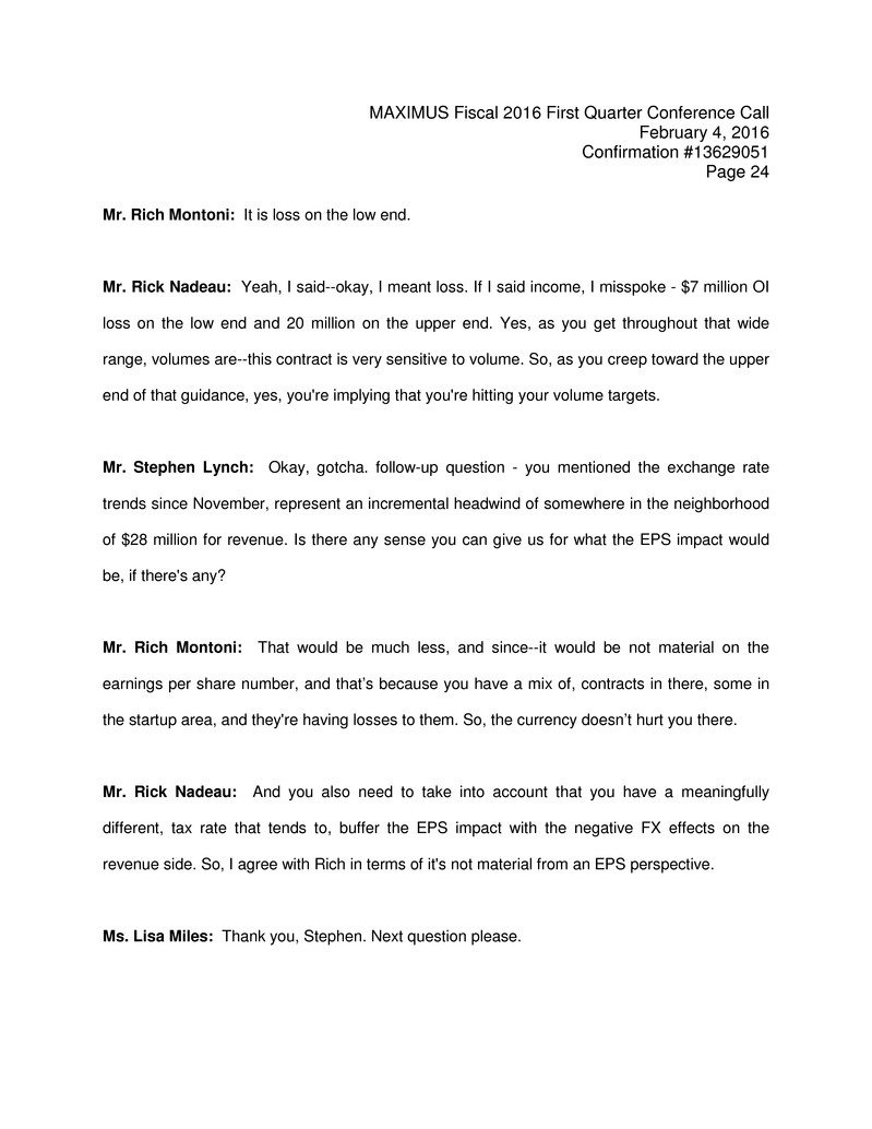 MAXIMUS Fiscal 2016 First Quarter Conference Call February 4, 2016 Confirmation #13629051 Page 24 Mr. Rich Montoni: It is loss on the low end. Mr. Rick Nadeau: Yeah, I said--okay, I meant loss. If I said income, I misspoke - $7 million OI loss on the low end and 20 million on the upper end. Yes, as you get throughout that wide range, volumes are--this contract is very sensitive to volume. So, as you creep toward the upper end of that guidance, yes, you're implying that you're hitting your volume targets. Mr. Stephen Lynch: Okay, gotcha. follow-up question - you mentioned the exchange rate trends since November, represent an incremental headwind of somewhere in the neighborhood of $28 million for revenue. Is there any sense you can give us for what the EPS impact would be, if there's any? Mr. Rich Montoni: That would be much less, and since--it would be not material on the earnings per share number, and that’s because you have a mix of, contracts in there, some in the startup area, and they're having losses to them. So, the currency doesn’t hurt you there. Mr. Rick Nadeau: And you also need to take into account that you have a meaningfully different, tax rate that tends to, buffer the EPS impact with the negative FX effects on the revenue side. So, I agree with Rich in terms of it's not material from an EPS perspective. Ms. Lisa Miles: Thank you, Stephen. Next question please.