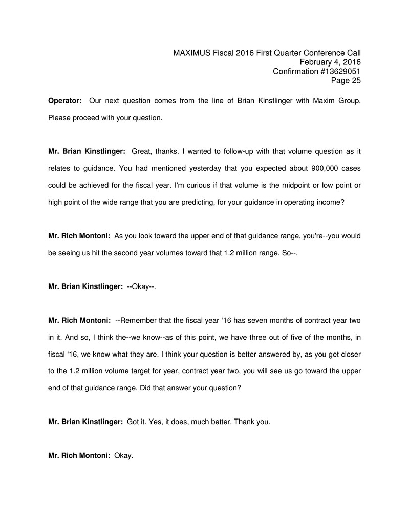MAXIMUS Fiscal 2016 First Quarter Conference Call February 4, 2016 Confirmation #13629051 Page 25 Operator: Our next question comes from the line of Brian Kinstlinger with Maxim Group. Please proceed with your question. Mr. Brian Kinstlinger: Great, thanks. I wanted to follow-up with that volume question as it relates to guidance. You had mentioned yesterday that you expected about 900,000 cases could be achieved for the fiscal year. I'm curious if that volume is the midpoint or low point or high point of the wide range that you are predicting, for your guidance in operating income? Mr. Rich Montoni: As you look toward the upper end of that guidance range, you're--you would be seeing us hit the second year volumes toward that 1.2 million range. So--. Mr. Brian Kinstlinger: --Okay--. Mr. Rich Montoni: --Remember that the fiscal year ‘16 has seven months of contract year two in it. And so, I think the--we know--as of this point, we have three out of five of the months, in fiscal ‘16, we know what they are. I think your question is better answered by, as you get closer to the 1.2 million volume target for year, contract year two, you will see us go toward the upper end of that guidance range. Did that answer your question? Mr. Brian Kinstlinger: Got it. Yes, it does, much better. Thank you. Mr. Rich Montoni: Okay.