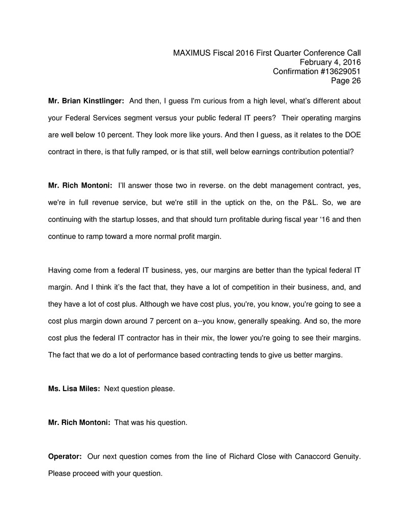 MAXIMUS Fiscal 2016 First Quarter Conference Call February 4, 2016 Confirmation #13629051 Page 26 Mr. Brian Kinstlinger: And then, I guess I'm curious from a high level, what’s different about your Federal Services segment versus your public federal IT peers? Their operating margins are well below 10 percent. They look more like yours. And then I guess, as it relates to the DOE contract in there, is that fully ramped, or is that still, well below earnings contribution potential? Mr. Rich Montoni: I’ll answer those two in reverse. on the debt management contract, yes, we're in full revenue service, but we're still in the uptick on the, on the P&L. So, we are continuing with the startup losses, and that should turn profitable during fiscal year ‘16 and then continue to ramp toward a more normal profit margin. Having come from a federal IT business, yes, our margins are better than the typical federal IT margin. And I think it’s the fact that, they have a lot of competition in their business, and, and they have a lot of cost plus. Although we have cost plus, you're, you know, you're going to see a cost plus margin down around 7 percent on a--you know, generally speaking. And so, the more cost plus the federal IT contractor has in their mix, the lower you're going to see their margins. The fact that we do a lot of performance based contracting tends to give us better margins. Ms. Lisa Miles: Next question please. Mr. Rich Montoni: That was his question. Operator: Our next question comes from the line of Richard Close with Canaccord Genuity. Please proceed with your question.