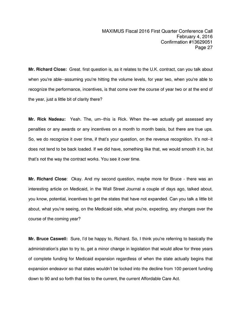 MAXIMUS Fiscal 2016 First Quarter Conference Call February 4, 2016 Confirmation #13629051 Page 27 Mr. Richard Close: Great. first question is, as it relates to the U.K. contract, can you talk about when you're able--assuming you're hitting the volume levels, for year two, when you're able to recognize the performance, incentives, is that come over the course of year two or at the end of the year, just a little bit of clarity there? Mr. Rick Nadeau: Yeah. The, um--this is Rick. When the--we actually get assessed any penalties or any awards or any incentives on a month to month basis, but there are true ups. So, we do recognize it over time, if that’s your question, on the revenue recognition. It’s not--it does not tend to be back loaded. If we did have, something like that, we would smooth it in, but that’s not the way the contract works. You see it over time. Mr. Richard Close: Okay. And my second question, maybe more for Bruce - there was an interesting article on Medicaid, in the Wall Street Journal a couple of days ago, talked about, you know, potential, incentives to get the states that have not expanded. Can you talk a little bit about, what you're seeing, on the Medicaid side, what you're, expecting, any changes over the course of the coming year? Mr. Bruce Caswell: Sure, I’d be happy to, Richard. So, I think you're referring to basically the administration’s plan to try to, get a minor change in legislation that would allow for three years of complete funding for Medicaid expansion regardless of when the state actually begins that expansion endeavor so that states wouldn’t be locked into the decline from 100 percent funding down to 90 and so forth that ties to the current, the current Affordable Care Act.