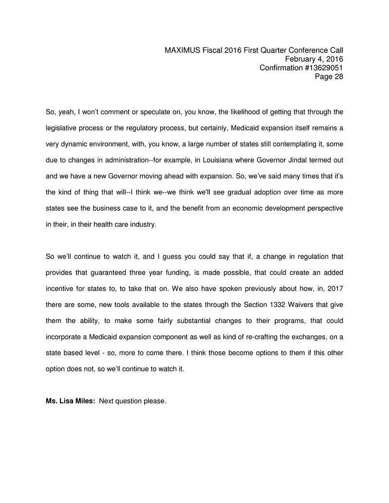 MAXIMUS Fiscal 2016 First Quarter Conference Call February 4, 2016 Confirmation #13629051 Page 28 So, yeah, I won’t comment or speculate on, you know, the likelihood of getting that through the legislative process or the regulatory process, but certainly, Medicaid expansion itself remains a very dynamic environment, with, you know, a large number of states still contemplating it, some due to changes in administration--for example, in Louisiana where Governor Jindal termed out and we have a new Governor moving ahead with expansion. So, we’ve said many times that it’s the kind of thing that will--I think we--we think we'll see gradual adoption over time as more states see the business case to it, and the benefit from an economic development perspective in their, in their health care industry. So we’ll continue to watch it, and I guess you could say that if, a change in regulation that provides that guaranteed three year funding, is made possible, that could create an added incentive for states to, to take that on. We also have spoken previously about how, in, 2017 there are some, new tools available to the states through the Section 1332 Waivers that give them the ability, to make some fairly substantial changes to their programs, that could incorporate a Medicaid expansion component as well as kind of re-crafting the exchanges, on a state based level - so, more to come there. I think those become options to them if this other option does not, so we’ll continue to watch it. Ms. Lisa Miles: Next question please.