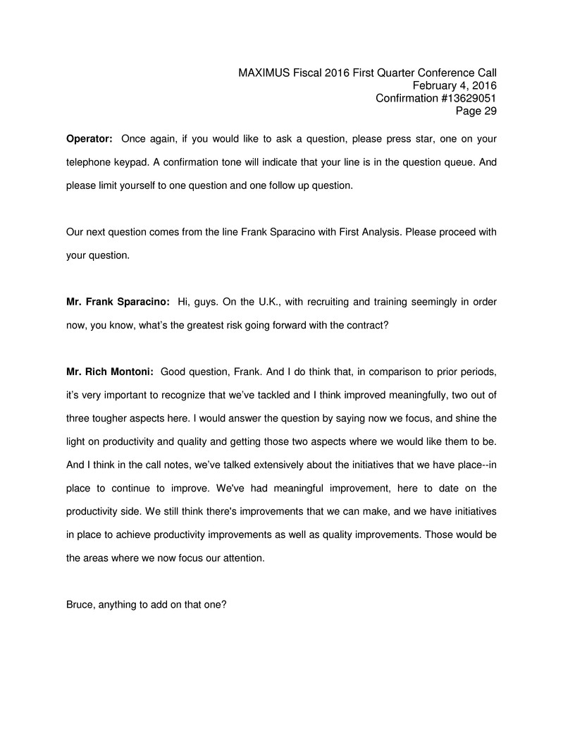 MAXIMUS Fiscal 2016 First Quarter Conference Call February 4, 2016 Confirmation #13629051 Page 29 Operator: Once again, if you would like to ask a question, please press star, one on your telephone keypad. A confirmation tone will indicate that your line is in the question queue. And please limit yourself to one question and one follow up question. Our next question comes from the line Frank Sparacino with First Analysis. Please proceed with your question. Mr. Frank Sparacino: Hi, guys. On the U.K., with recruiting and training seemingly in order now, you know, what’s the greatest risk going forward with the contract? Mr. Rich Montoni: Good question, Frank. And I do think that, in comparison to prior periods, it’s very important to recognize that we’ve tackled and I think improved meaningfully, two out of three tougher aspects here. I would answer the question by saying now we focus, and shine the light on productivity and quality and getting those two aspects where we would like them to be. And I think in the call notes, we’ve talked extensively about the initiatives that we have place--in place to continue to improve. We've had meaningful improvement, here to date on the productivity side. We still think there's improvements that we can make, and we have initiatives in place to achieve productivity improvements as well as quality improvements. Those would be the areas where we now focus our attention. Bruce, anything to add on that one?