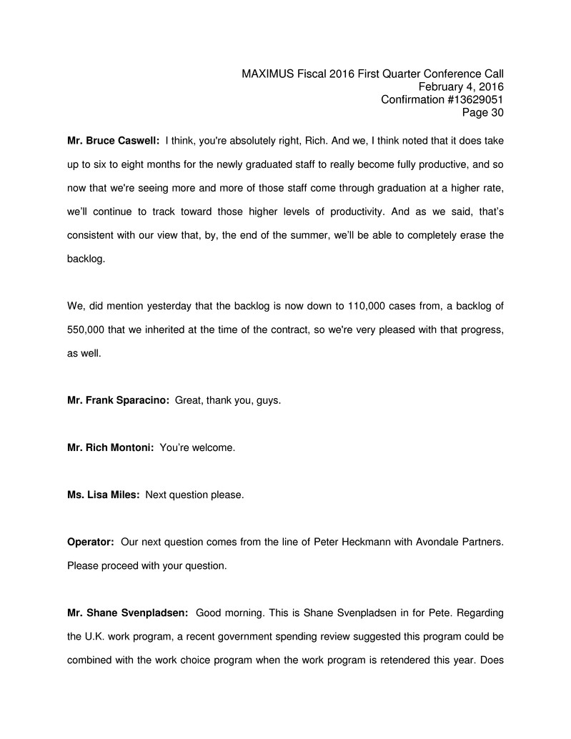 MAXIMUS Fiscal 2016 First Quarter Conference Call February 4, 2016 Confirmation #13629051 Page 30 Mr. Bruce Caswell: I think, you're absolutely right, Rich. And we, I think noted that it does take up to six to eight months for the newly graduated staff to really become fully productive, and so now that we're seeing more and more of those staff come through graduation at a higher rate, we’ll continue to track toward those higher levels of productivity. And as we said, that’s consistent with our view that, by, the end of the summer, we’ll be able to completely erase the backlog. We, did mention yesterday that the backlog is now down to 110,000 cases from, a backlog of 550,000 that we inherited at the time of the contract, so we're very pleased with that progress, as well. Mr. Frank Sparacino: Great, thank you, guys. Mr. Rich Montoni: You’re welcome. Ms. Lisa Miles: Next question please. Operator: Our next question comes from the line of Peter Heckmann with Avondale Partners. Please proceed with your question. Mr. Shane Svenpladsen: Good morning. This is Shane Svenpladsen in for Pete. Regarding the U.K. work program, a recent government spending review suggested this program could be combined with the work choice program when the work program is retendered this year. Does