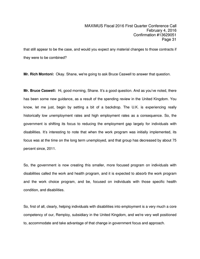 MAXIMUS Fiscal 2016 First Quarter Conference Call February 4, 2016 Confirmation #13629051 Page 31 that still appear to be the case, and would you expect any material changes to those contracts if they were to be combined? Mr. Rich Montoni: Okay. Shane, we're going to ask Bruce Caswell to answer that question. Mr. Bruce Caswell: Hi, good morning, Shane. It’s a good question. And as you’ve noted, there has been some new guidance, as a result of the spending review in the United Kingdom. You know, let me just, begin by setting a bit of a backdrop. The U.K. is experiencing really historically low unemployment rates and high employment rates as a consequence. So, the government is shifting its focus to reducing the employment gap largely for individuals with disabilities. It’s interesting to note that when the work program was initially implemented, its focus was at the time on the long term unemployed, and that group has decreased by about 75 percent since, 2011. So, the government is now creating this smaller, more focused program on individuals with disabilities called the work and health program, and it is expected to absorb the work program and the work choice program, and be, focused on individuals with those specific health condition, and disabilities. So, first of all, clearly, helping individuals with disabilities into employment is a very much a core competency of our, Remploy, subsidiary in the United Kingdom, and we're very well positioned to, accommodate and take advantage of that change in government focus and approach.