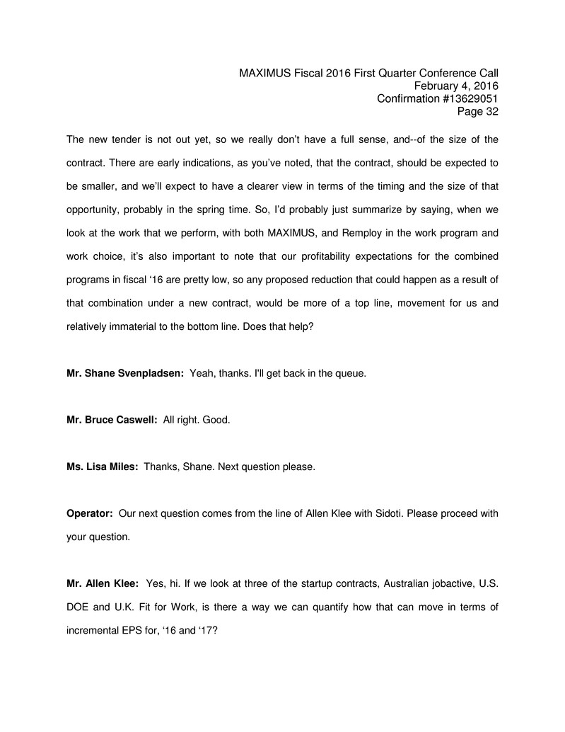 MAXIMUS Fiscal 2016 First Quarter Conference Call February 4, 2016 Confirmation #13629051 Page 32 The new tender is not out yet, so we really don’t have a full sense, and--of the size of the contract. There are early indications, as you’ve noted, that the contract, should be expected to be smaller, and we’ll expect to have a clearer view in terms of the timing and the size of that opportunity, probably in the spring time. So, I’d probably just summarize by saying, when we look at the work that we perform, with both MAXIMUS, and Remploy in the work program and work choice, it’s also important to note that our profitability expectations for the combined programs in fiscal ‘16 are pretty low, so any proposed reduction that could happen as a result of that combination under a new contract, would be more of a top line, movement for us and relatively immaterial to the bottom line. Does that help? Mr. Shane Svenpladsen: Yeah, thanks. I'll get back in the queue. Mr. Bruce Caswell: All right. Good. Ms. Lisa Miles: Thanks, Shane. Next question please. Operator: Our next question comes from the line of Allen Klee with Sidoti. Please proceed with your question. Mr. Allen Klee: Yes, hi. If we look at three of the startup contracts, Australian jobactive, U.S. DOE and U.K. Fit for Work, is there a way we can quantify how that can move in terms of incremental EPS for, ‘16 and ‘17?
