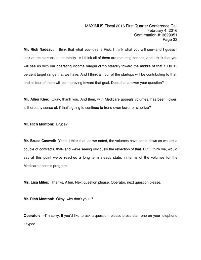 MAXIMUS Fiscal 2016 First Quarter Conference Call February 4, 2016 Confirmation #13629051 Page 33 Mr. Rick Nadeau: I think that what you--this is Rick. I think what you will see--and I guess I look at the startups in the totality--is I think all of them are maturing phases, and I think that you will see us with our operating income margin climb steadily toward the middle of that 10 to 15 percent target range that we have. And I think all four of the startups will be contributing to that, and all four of them will be improving toward that goal. Does that answer your question? Mr. Allen Klee: Okay, thank you. And then, with Medicare appeals volumes, has been, lower, is there any sense of, if that’s going to continue to trend even lower or stabilize? Mr. Rich Montoni: Bruce? Mr. Bruce Caswell: Yeah, I think that, as we noted, the volumes have come down as we lost a couple of contracts, that--and we're seeing obviously the reflection of that. But, I think we, would say at this point we’ve reached a long term steady state, in terms of the volumes for the Medicare appeals program. Ms. Lisa Miles: Thanks, Allen. Next question please. Operator, next question please. Mr. Rich Montoni: Okay, why don't you--? Operator: --I'm sorry. If you'd like to ask a question, please press star, one on your telephone keypad.