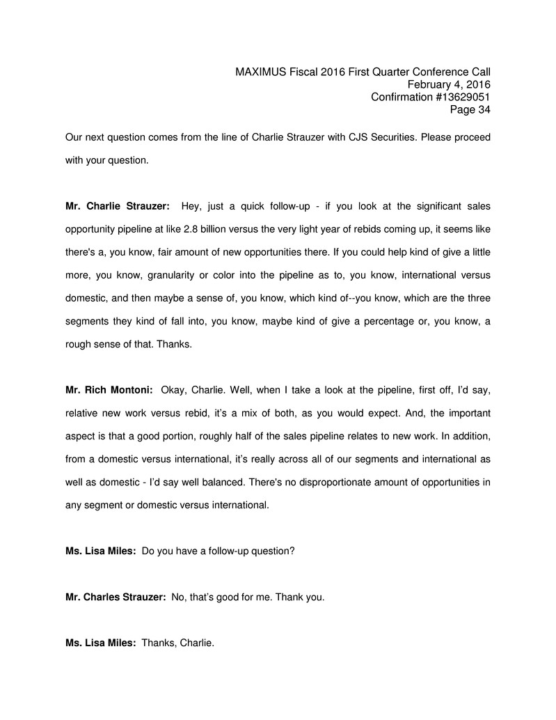 MAXIMUS Fiscal 2016 First Quarter Conference Call February 4, 2016 Confirmation #13629051 Page 34 Our next question comes from the line of Charlie Strauzer with CJS Securities. Please proceed with your question. Mr. Charlie Strauzer: Hey, just a quick follow-up - if you look at the significant sales opportunity pipeline at like 2.8 billion versus the very light year of rebids coming up, it seems like there's a, you know, fair amount of new opportunities there. If you could help kind of give a little more, you know, granularity or color into the pipeline as to, you know, international versus domestic, and then maybe a sense of, you know, which kind of--you know, which are the three segments they kind of fall into, you know, maybe kind of give a percentage or, you know, a rough sense of that. Thanks. Mr. Rich Montoni: Okay, Charlie. Well, when I take a look at the pipeline, first off, I’d say, relative new work versus rebid, it’s a mix of both, as you would expect. And, the important aspect is that a good portion, roughly half of the sales pipeline relates to new work. In addition, from a domestic versus international, it’s really across all of our segments and international as well as domestic - I’d say well balanced. There's no disproportionate amount of opportunities in any segment or domestic versus international. Ms. Lisa Miles: Do you have a follow-up question? Mr. Charles Strauzer: No, that’s good for me. Thank you. Ms. Lisa Miles: Thanks, Charlie.