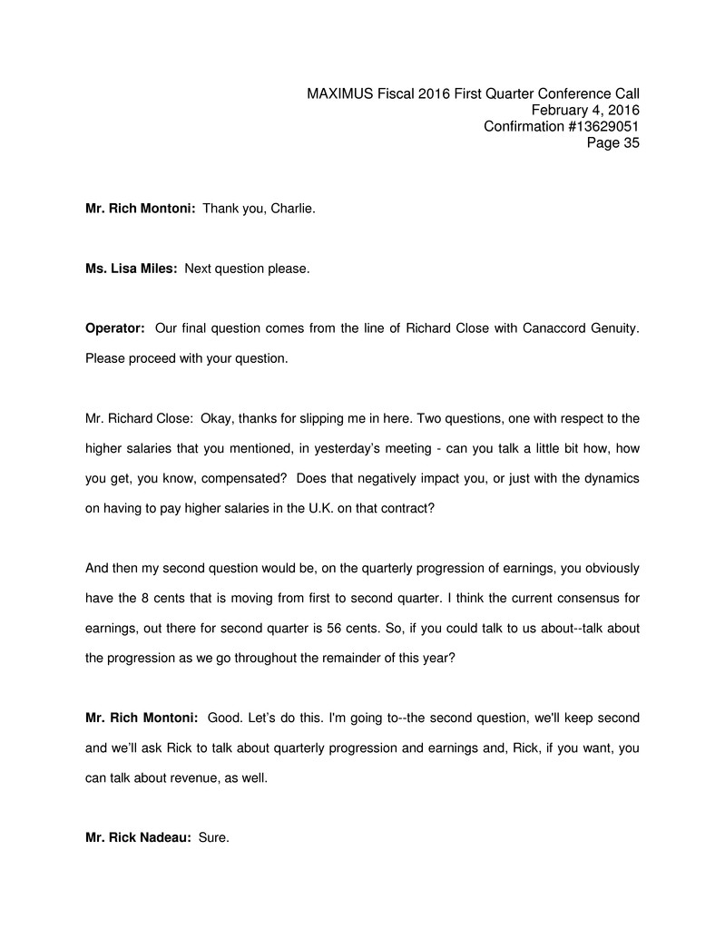 MAXIMUS Fiscal 2016 First Quarter Conference Call February 4, 2016 Confirmation #13629051 Page 35 Mr. Rich Montoni: Thank you, Charlie. Ms. Lisa Miles: Next question please. Operator: Our final question comes from the line of Richard Close with Canaccord Genuity. Please proceed with your question. Mr. Richard Close: Okay, thanks for slipping me in here. Two questions, one with respect to the higher salaries that you mentioned, in yesterday’s meeting - can you talk a little bit how, how you get, you know, compensated? Does that negatively impact you, or just with the dynamics on having to pay higher salaries in the U.K. on that contract? And then my second question would be, on the quarterly progression of earnings, you obviously have the 8 cents that is moving from first to second quarter. I think the current consensus for earnings, out there for second quarter is 56 cents. So, if you could talk to us about--talk about the progression as we go throughout the remainder of this year? Mr. Rich Montoni: Good. Let’s do this. I'm going to--the second question, we'll keep second and we’ll ask Rick to talk about quarterly progression and earnings and, Rick, if you want, you can talk about revenue, as well. Mr. Rick Nadeau: Sure.