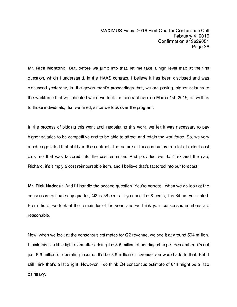 MAXIMUS Fiscal 2016 First Quarter Conference Call February 4, 2016 Confirmation #13629051 Page 36 Mr. Rich Montoni: But, before we jump into that, let me take a high level stab at the first question, which I understand, in the HAAS contract, I believe it has been disclosed and was discussed yesterday, in, the government’s proceedings that, we are paying, higher salaries to the workforce that we inherited when we took the contract over on March 1st, 2015, as well as to those individuals, that we hired, since we took over the program. In the process of bidding this work and, negotiating this work, we felt it was necessary to pay higher salaries to be competitive and to be able to attract and retain the workforce. So, we very much negotiated that ability in the contract. The nature of this contract is to a lot of extent cost plus, so that was factored into the cost equation. And provided we don’t exceed the cap, Richard, it’s simply a cost reimbursable item, and I believe that’s factored into our forecast. Mr. Rick Nadeau: And I’ll handle the second question. You're correct - when we do look at the consensus estimates by quarter, Q2 is 56 cents. If you add the 8 cents, it is 64, as you noted. From there, we look at the remainder of the year, and we think your consensus numbers are reasonable. Now, when we look at the consensus estimates for Q2 revenue, we see it at around 594 million. I think this is a little light even after adding the 8.6 million of pending change. Remember, it’s not just 8.6 million of operating income. It'd be 8.6 million of revenue you would add to that. But, I still think that’s a little light. However, I do think Q4 consensus estimate of 644 might be a little bit heavy.
