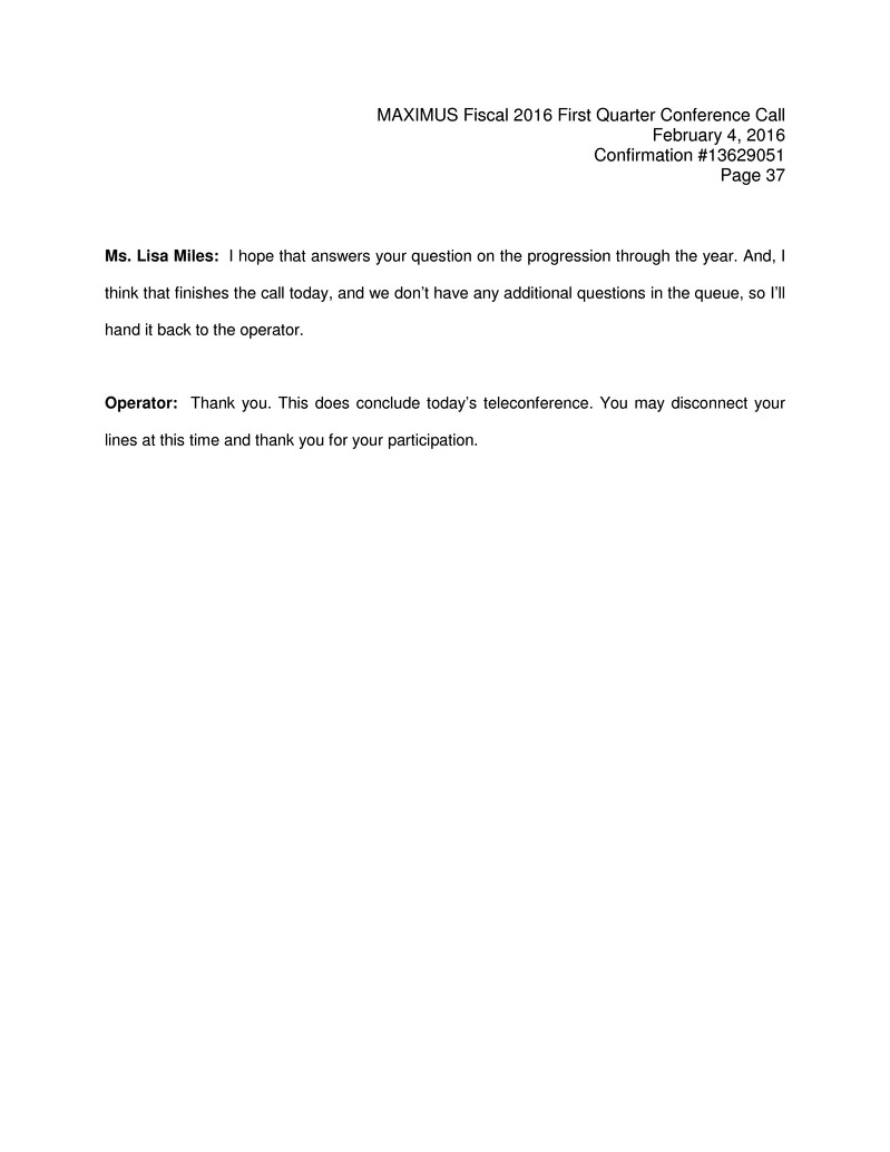 MAXIMUS Fiscal 2016 First Quarter Conference Call February 4, 2016 Confirmation #13629051 Page 37 Ms. Lisa Miles: I hope that answers your question on the progression through the year. And, I think that finishes the call today, and we don’t have any additional questions in the queue, so I’ll hand it back to the operator. Operator: Thank you. This does conclude today’s teleconference. You may disconnect your lines at this time and thank you for your participation.