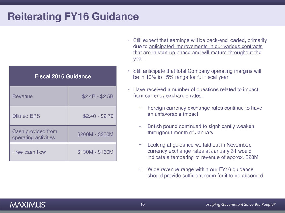 MAXIMUS Fiscal 2016 First Quarter Conference Call February 4, 2016 Confirmation #13629051 Page 8 We still expect that earnings will be backend loaded, primarily due to anticipated improvements in our various contracts that are in the startup phase and will mature throughout the year. We still expect that total company operating margins will be in the lower end of the 10 to 15 percent range for the full fiscal year. We’ve received a number of questions related to the impact from currency exchange rates and how that might affect our guidance. Foreign currency exchange rates continue to have an unfavorable impact. The British pound continued to significantly weaken throughout the month of January. So, looking at the guidance we laid out in our November call, the currency exchange rates at January 31 would indicate a tempering of revenue of approximately $28 million. However, the wide range within our fiscal 2016 guidance should provide sufficient room for it to be absorbed. Thank you for your continued interest, and now I will turn the call over to Rich. Mr. Rich Montoni: Thank you, Rick, and good morning, everyone. As Rick mentioned, we have a pending change order that we now expect to be recognized in the second quarter. If the change order had been finalized in the first quarter, we would have been in line with our expectations for Q1. As expected, several large startups are also tempering earnings at this time.