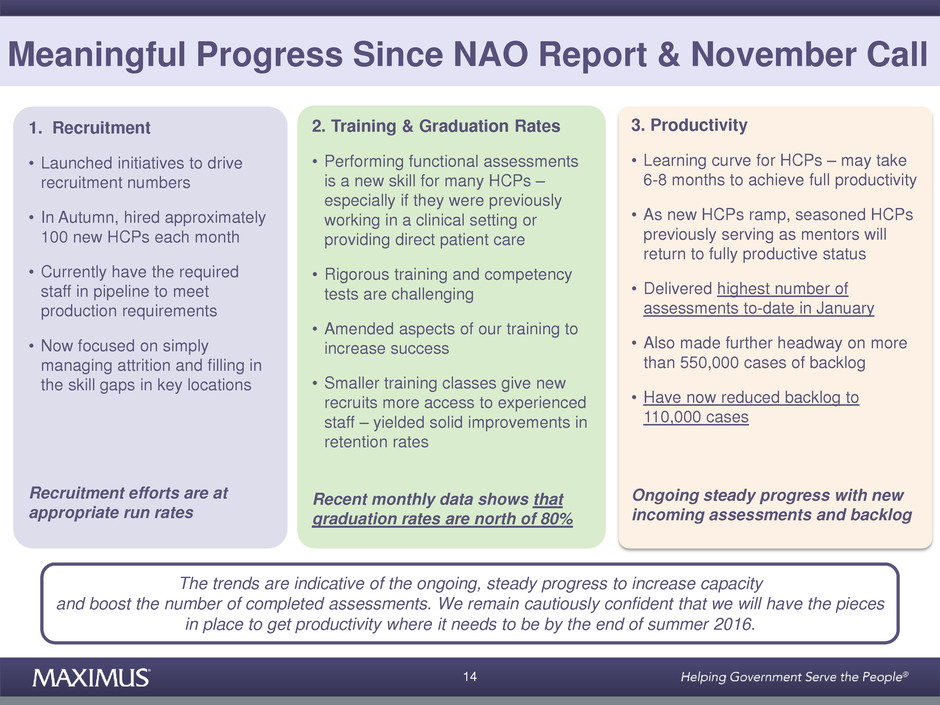 MAXIMUS Fiscal 2016 First Quarter Conference Call February 4, 2016 Confirmation #13629051 Page 10 As a reminder, our ability to hit the volume targets is tied directly to three areas - one, the number of health care professionals that we recruit, two, the number that complete training and graduate, and three, the productivity of these new recruits. As I mentioned last quarter, we launched several initiatives to help drive our recruitment numbers, which have brought in a solid stream of well qualified candidates. During the autumn timeframe, we were hiring approximately 100 new health care professionals each month. We currently have the required staff in the pipeline to meet our production requirements, and we are now turning our attention to simply managing attrition and filling in the gaps in key locations. So, real progress here in our recruitment efforts are at the appropriate run rates. In the area of training and graduation rates, it’s fair to ask why is it so difficult for a new health care professional to complete the training. Performing functional assessments is a new skill for many health care professionals, especially if they were previously working in a clinical setting or providing direct patient care. The training program is rigorous, and the competency tests are challenging. We amended certain aspects of our training to help increase success. Our smaller training classes are giving new recruits more access to experienced staff. This individualized support has yielded solid improvements in retention rates. These changes have made a marked difference, and our most recent monthly data shows that graduation rates are north of 80 percent - so meaningful improvement in this area, as well.