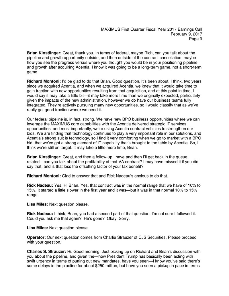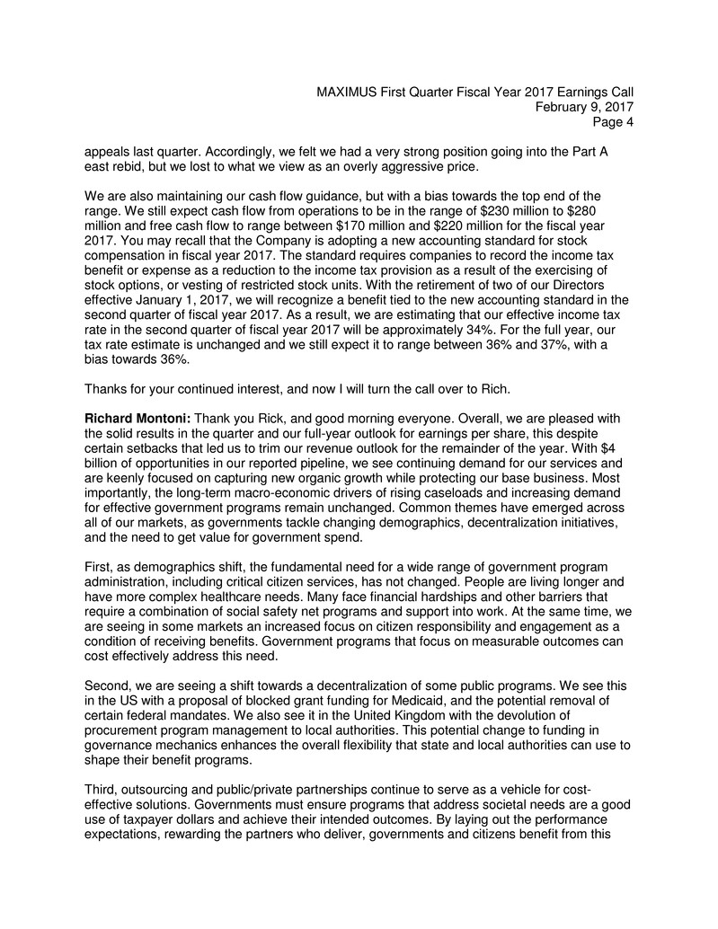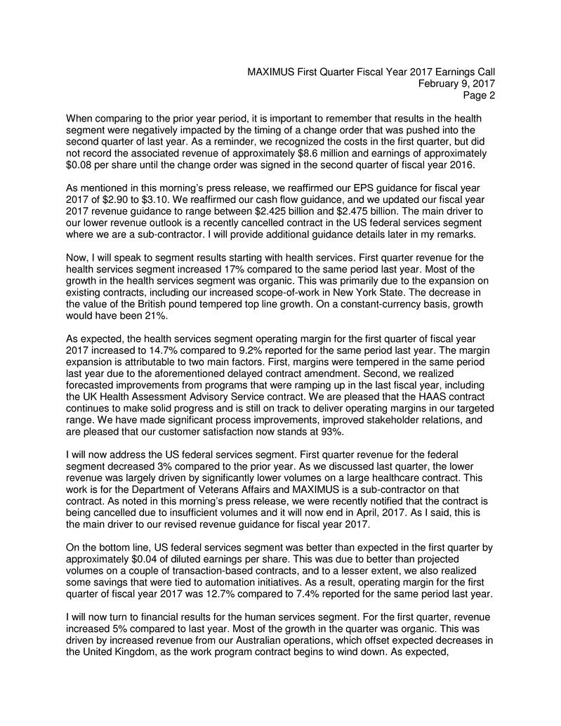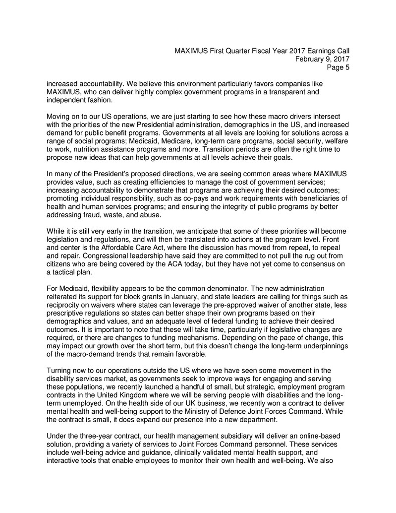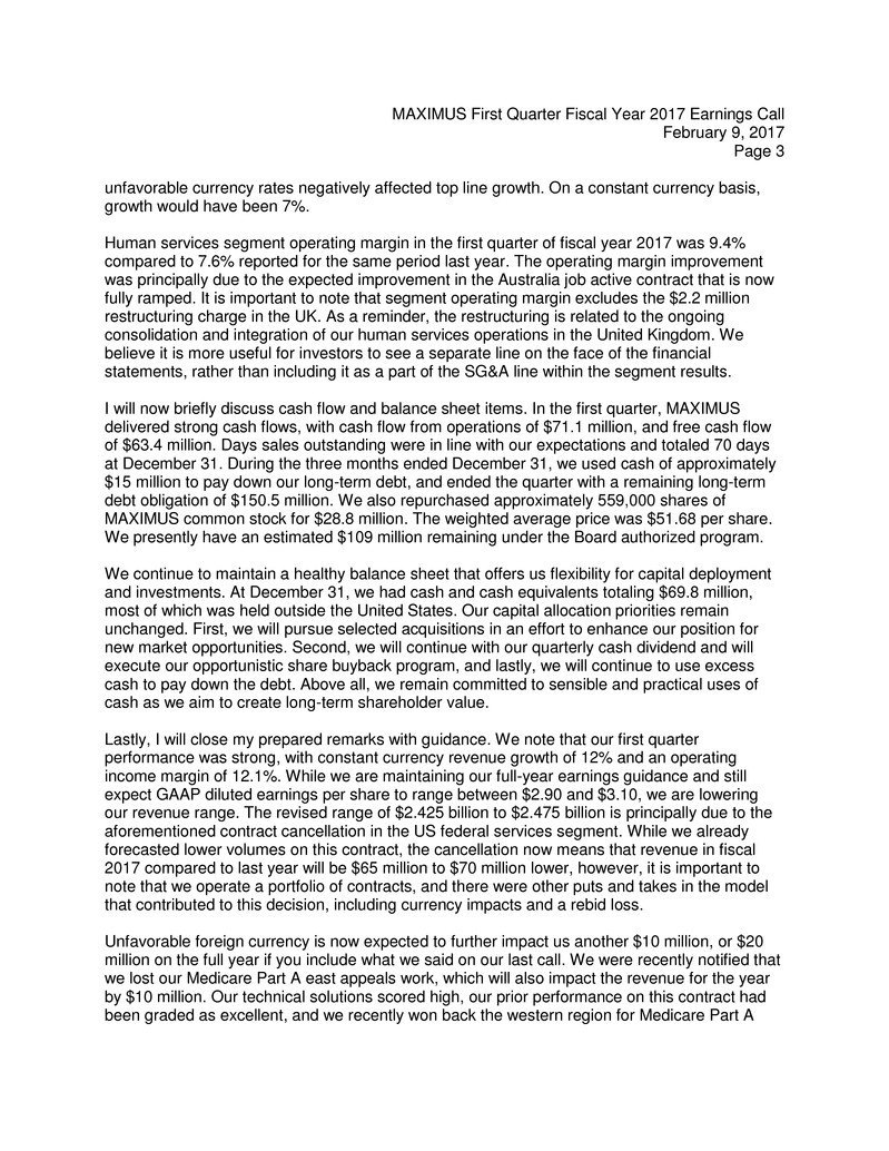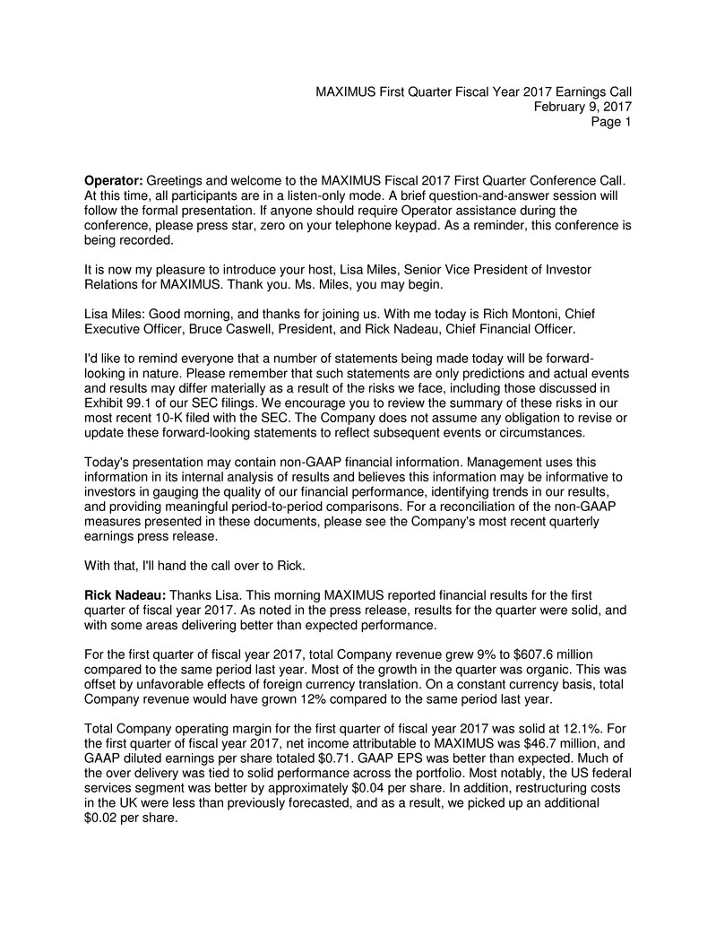 MAXIMUS First Quarter Fiscal Year 2017 Earnings Call