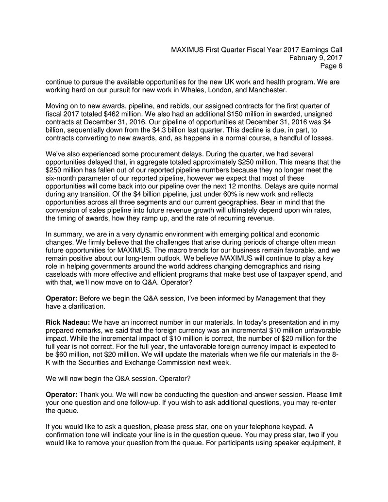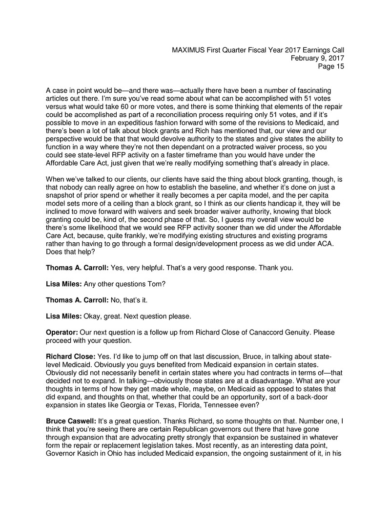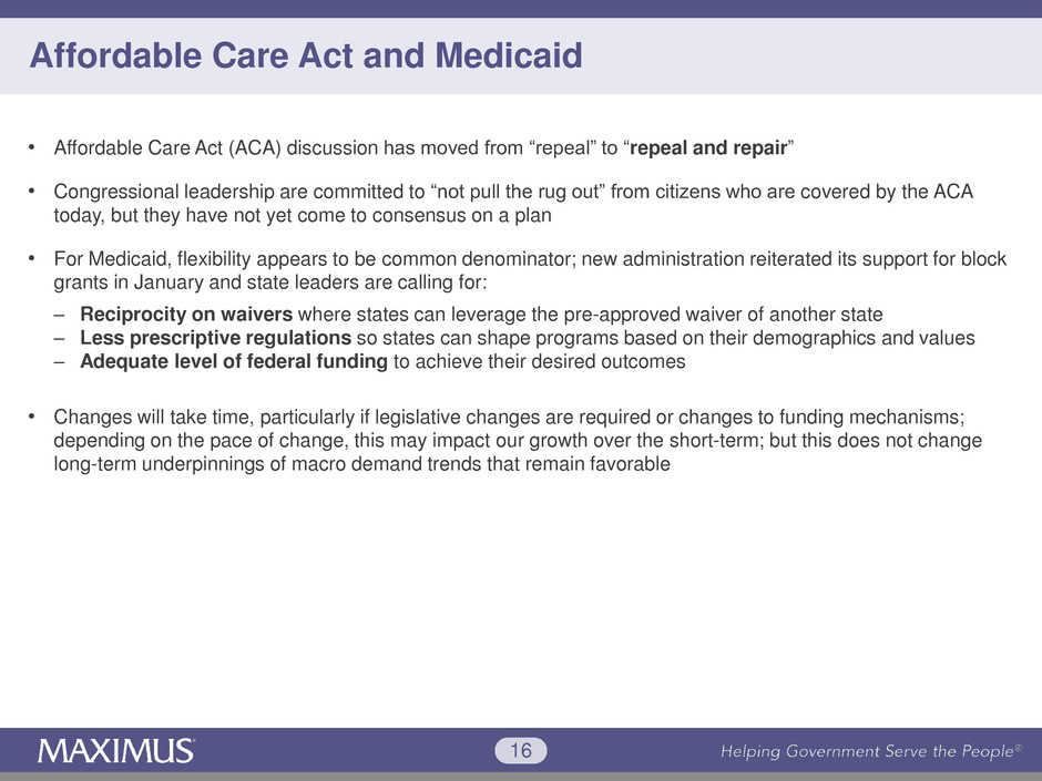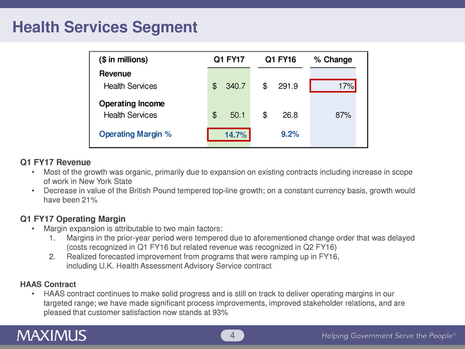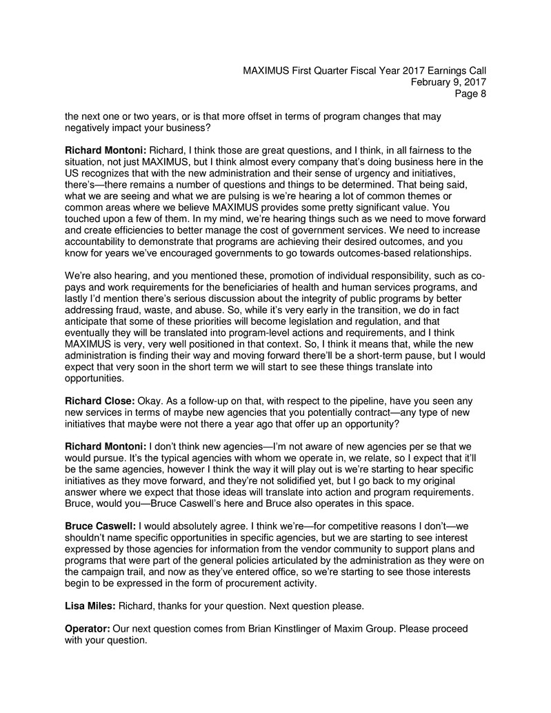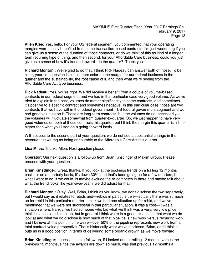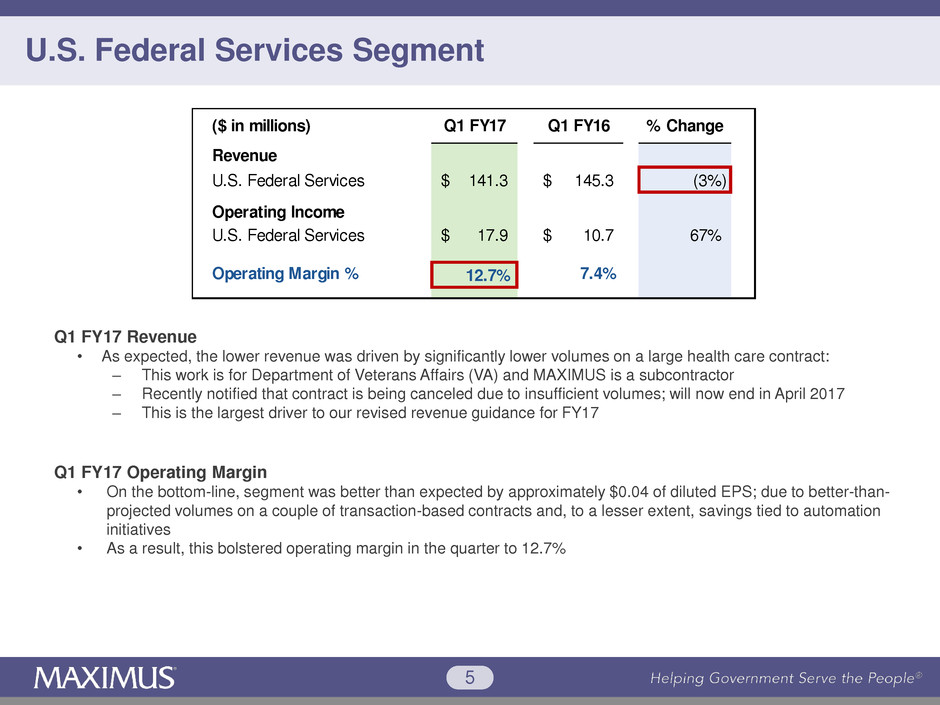 MAXIMUS First Quarter Fiscal Year 2017 Earnings Call