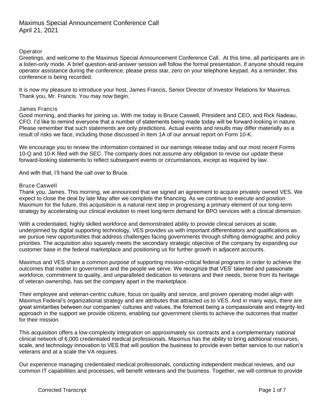 Maximus Special Announcement Conference Call April 21, 2021 Corrected Transcript Page 1 of 7 Operator Greetings, and welcome to the Maximus Special Announcement Conference Call. At this time, all participants are in a listen-only mode. A brief question-and-answer session will follow the formal presentation. If anyone should require operator assistance during the conference, please press star, zero on your telephone keypad. As a reminder, this conference is being recorded. It is now my pleasure to introduce your host, James Francis, Senior Director of Investor Relations for Maximus. Thank you, Mr. Francis. You may now begin. James Francis Good morning, and thanks for joining us. With me today is Bruce Caswell, President and CEO, and Rick Nadeau, CFO. I’d like to remind everyone that a number of statements being made today will be forward-looking in nature. Please remember that such statements are only predictions. Actual events and results may differ materially as a result of risks we face, including those discussed in Item 1A of our annual report on Form 10-K. We encourage you to review the information contained in our earnings release today and our most recent Forms 10-Q and 10-K filed with the SEC. The company does not assume any obligation to revise our update these forward-looking statements to reflect subsequent events or circumstances, except as required by law. And with that, I’ll hand the call over to Bruce. Bruce Caswell Thank you, James. This morning, we announced that we signed an agreement to acquire privately owned VES. We expect to close the deal by late May after we complete the financing. As we continue to execute and position Maximum for the future, this acquisition is a natural next step in progressing a primary element of our long-term strategy by accelerating our clinical evolution to meet long-term demand for BPO services with a clinical dimension. With a credentialed, highly skilled workforce and demonstrated ability to provide clinical services at scale, underpinned by digital supporting technology, VES provides us with important differentiators and qualifications as we pursue new opportunities that address challenges facing governments through shifting demographic and policy priorities. The acquisition also squarely meets the secondary strategic objective of the company by expanding our customer base in the federal marketplace and positioning us for further growth in adjacent accounts. Maximus and VES share a common purpose of supporting mission-critical federal programs in order to achieve the outcomes that matter to government and the people we serve. We recognize that VES’ talented and passionate workforce, commitment to quality, and unparalleled dedication to veterans and their needs, borne from its heritage of veteran ownership, has set the company apart in the marketplace. Their employee and veteran-centric culture, focus on quality and service, and proven operating model align with Maximus Federal’s organizational strategy and are attributes that attracted us to VES. And in many ways, there are great similarities between our companies’ cultures and values, the foremost being a compassionate and integrity-led approach in the support we provide citizens, enabling our government clients to achieve the outcomes that matter for their mission. This acquisition offers a low-complexity integration on approximately six contracts and a complementary national clinical network of 6,000 credentialed medical professionals. Maximus has the ability to bring additional resources, scale, and technology innovation to VES that will position the business to provide even better service to our nation’s veterans and at a scale the VA requires. Our experience managing credentialed medical professionals, conducting independent medical reviews, and our common IT capabilities and processes, will benefit veterans and the business. Together, we will continue to provide