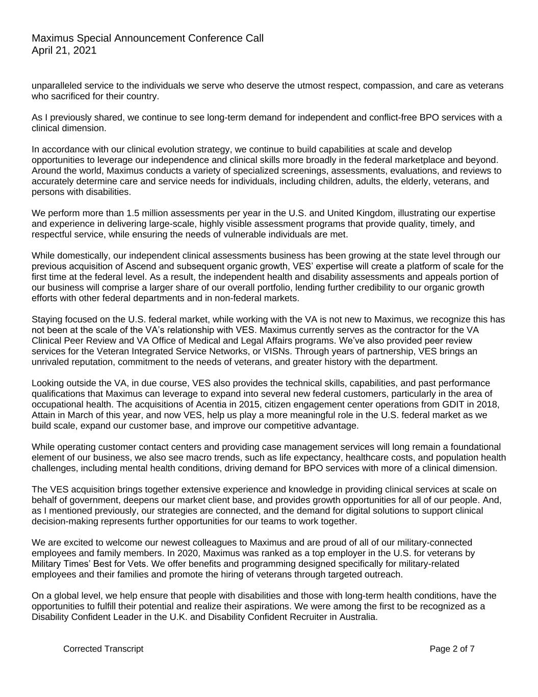 Maximus Special Announcement Conference Call April 21, 2021 Corrected Transcript Page 2 of 7 unparalleled service to the individuals we serve who deserve the utmost respect, compassion, and care as veterans who sacrificed for their country. As I previously shared, we continue to see long-term demand for independent and conflict-free BPO services with a clinical dimension. In accordance with our clinical evolution strategy, we continue to build capabilities at scale and develop opportunities to leverage our independence and clinical skills more broadly in the federal marketplace and beyond. Around the world, Maximus conducts a variety of specialized screenings, assessments, evaluations, and reviews to accurately determine care and service needs for individuals, including children, adults, the elderly, veterans, and persons with disabilities. We perform more than 1.5 million assessments per year in the U.S. and United Kingdom, illustrating our expertise and experience in delivering large-scale, highly visible assessment programs that provide quality, timely, and respectful service, while ensuring the needs of vulnerable individuals are met. While domestically, our independent clinical assessments business has been growing at the state level through our previous acquisition of Ascend and subsequent organic growth, VES’ expertise will create a platform of scale for the first time at the federal level. As a result, the independent health and disability assessments and appeals portion of our business will comprise a larger share of our overall portfolio, lending further credibility to our organic growth efforts with other federal departments and in non-federal markets. Staying focused on the U.S. federal market, while working with the VA is not new to Maximus, we recognize this has not been at the scale of the VA’s relationship with VES. Maximus currently serves as the contractor for the VA Clinical Peer Review and VA Office of Medical and Legal Affairs programs. We’ve also provided peer review services for the Veteran Integrated Service Networks, or VISNs. Through years of partnership, VES brings an unrivaled reputation, commitment to the needs of veterans, and greater history with the department. Looking outside the VA, in due course, VES also provides the technical skills, capabilities, and past performance qualifications that Maximus can leverage to expand into several new federal customers, particularly in the area of occupational health. The acquisitions of Acentia in 2015, citizen engagement center operations from GDIT in 2018, Attain in March of this year, and now VES, help us play a more meaningful role in the U.S. federal market as we build scale, expand our customer base, and improve our competitive advantage. While operating customer contact centers and providing case management services will long remain a foundational element of our business, we also see macro trends, such as life expectancy, healthcare costs, and population health challenges, including mental health conditions, driving demand for BPO services with more of a clinical dimension. The VES acquisition brings together extensive experience and knowledge in providing clinical services at scale on behalf of government, deepens our market client base, and provides growth opportunities for all of our people. And, as I mentioned previously, our strategies are connected, and the demand for digital solutions to support clinical decision-making represents further opportunities for our teams to work together. We are excited to welcome our newest colleagues to Maximus and are proud of all of our military-connected employees and family members. In 2020, Maximus was ranked as a top employer in the U.S. for veterans by Military Times’ Best for Vets. We offer benefits and programming designed specifically for military-related employees and their families and promote the hiring of veterans through targeted outreach. On a global level, we help ensure that people with disabilities and those with long-term health conditions, have the opportunities to fulfill their potential and realize their aspirations. We were among the first to be recognized as a Disability Confident Leader in the U.K. and Disability Confident Recruiter in Australia.