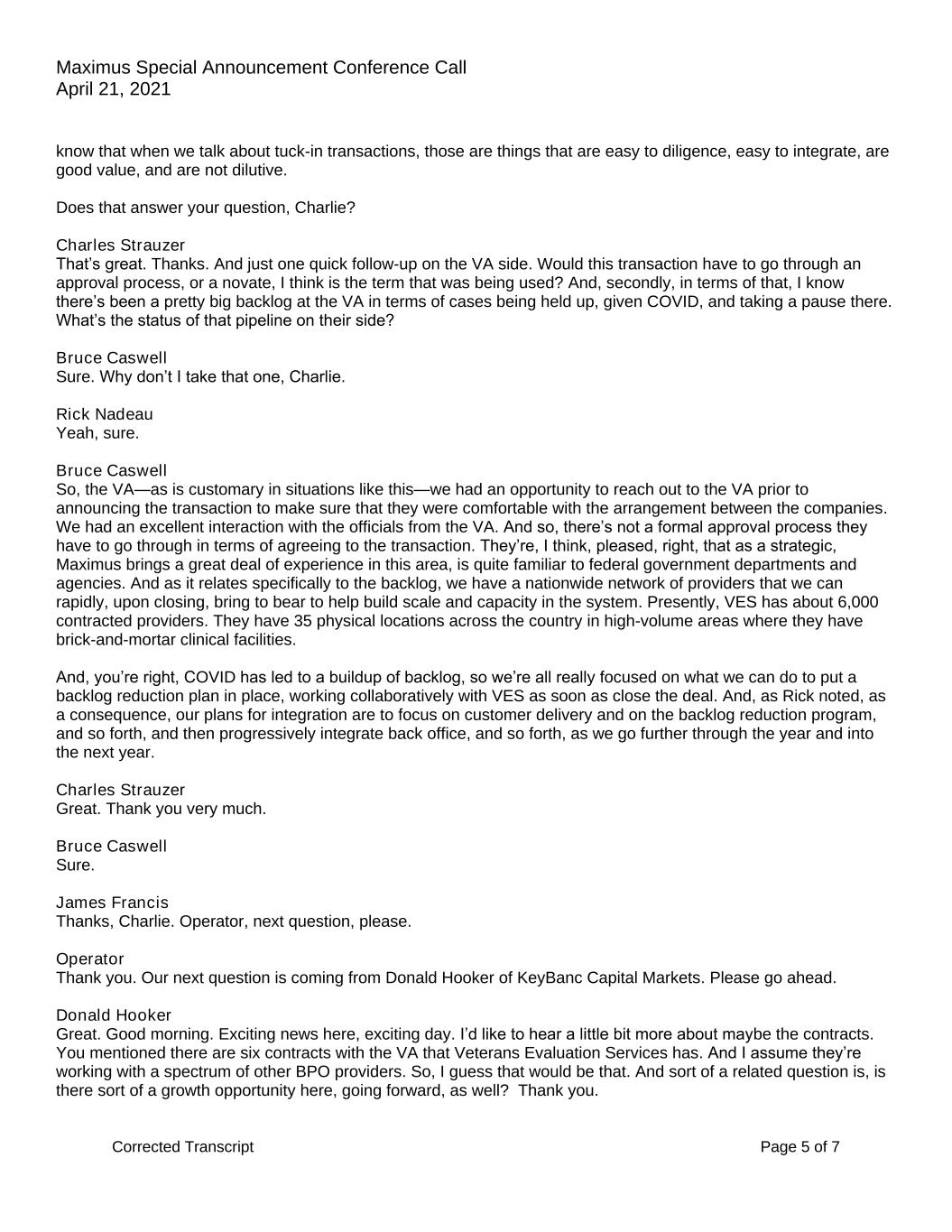 Maximus Special Announcement Conference Call April 21, 2021 Corrected Transcript Page 5 of 7 know that when we talk about tuck-in transactions, those are things that are easy to diligence, easy to integrate, are good value, and are not dilutive. Does that answer your question, Charlie? Charles Strauzer That’s great. Thanks. And just one quick follow-up on the VA side. Would this transaction have to go through an approval process, or a novate, I think is the term that was being used? And, secondly, in terms of that, I know there’s been a pretty big backlog at the VA in terms of cases being held up, given COVID, and taking a pause there. What’s the status of that pipeline on their side? Bruce Caswell Sure. Why don’t I take that one, Charlie. Rick Nadeau Yeah, sure. Bruce Caswell So, the VA—as is customary in situations like this—we had an opportunity to reach out to the VA prior to announcing the transaction to make sure that they were comfortable with the arrangement between the companies. We had an excellent interaction with the officials from the VA. And so, there’s not a formal approval process they have to go through in terms of agreeing to the transaction. They’re, I think, pleased, right, that as a strategic, Maximus brings a great deal of experience in this area, is quite familiar to federal government departments and agencies. And as it relates specifically to the backlog, we have a nationwide network of providers that we can rapidly, upon closing, bring to bear to help build scale and capacity in the system. Presently, VES has about 6,000 contracted providers. They have 35 physical locations across the country in high-volume areas where they have brick-and-mortar clinical facilities. And, you’re right, COVID has led to a buildup of backlog, so we’re all really focused on what we can do to put a backlog reduction plan in place, working collaboratively with VES as soon as close the deal. And, as Rick noted, as a consequence, our plans for integration are to focus on customer delivery and on the backlog reduction program, and so forth, and then progressively integrate back office, and so forth, as we go further through the year and into the next year. Charles Strauzer Great. Thank you very much. Bruce Caswell Sure. James Francis Thanks, Charlie. Operator, next question, please. Operator Thank you. Our next question is coming from Donald Hooker of KeyBanc Capital Markets. Please go ahead. Donald Hooker Great. Good morning. Exciting news here, exciting day. I’d like to hear a little bit more about maybe the contracts. You mentioned there are six contracts with the VA that Veterans Evaluation Services has. And I assume they’re working with a spectrum of other BPO providers. So, I guess that would be that. And sort of a related question is, is there sort of a growth opportunity here, going forward, as well? Thank you.