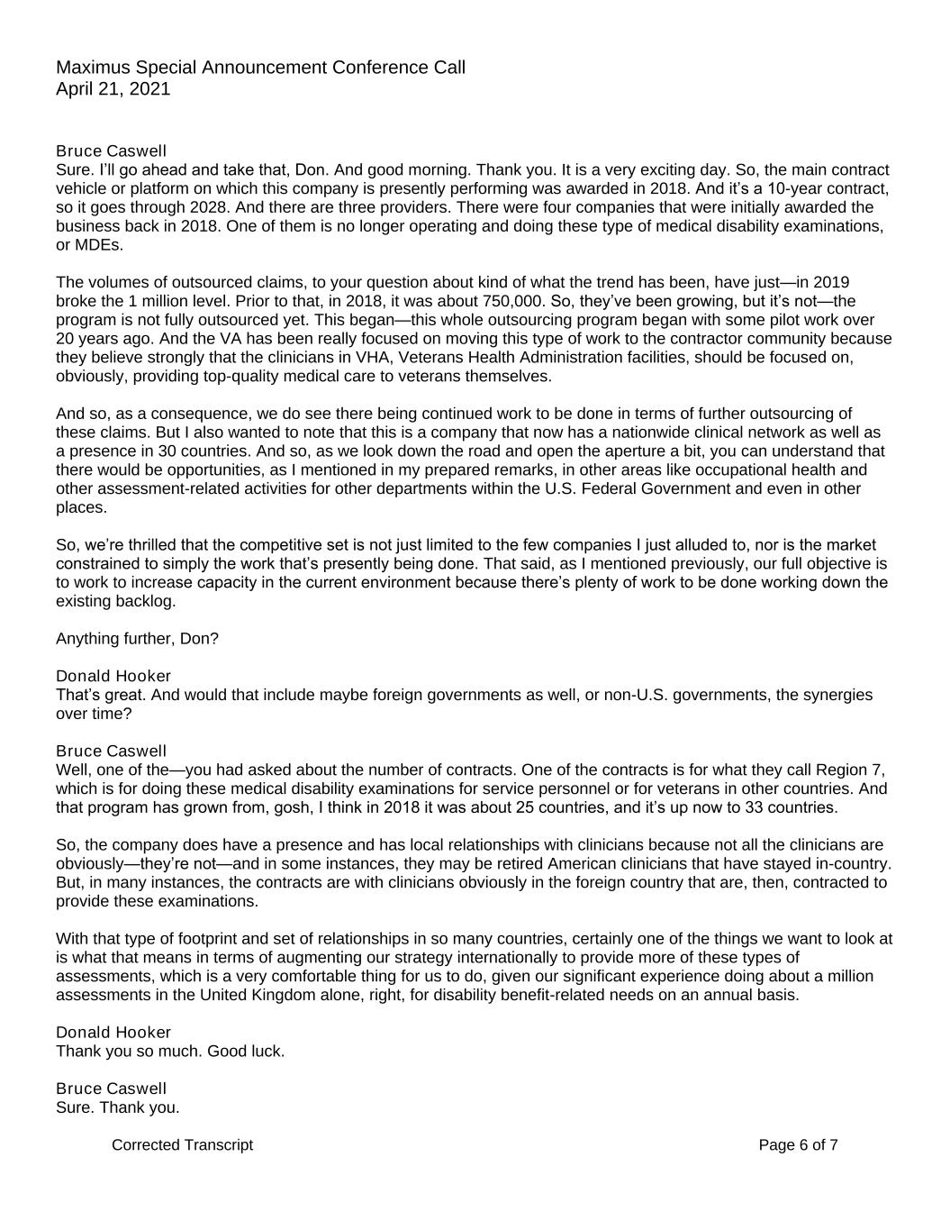 Maximus Special Announcement Conference Call April 21, 2021 Corrected Transcript Page 6 of 7 Bruce Caswell Sure. I’ll go ahead and take that, Don. And good morning. Thank you. It is a very exciting day. So, the main contract vehicle or platform on which this company is presently performing was awarded in 2018. And it’s a 10-year contract, so it goes through 2028. And there are three providers. There were four companies that were initially awarded the business back in 2018. One of them is no longer operating and doing these type of medical disability examinations, or MDEs. The volumes of outsourced claims, to your question about kind of what the trend has been, have just—in 2019 broke the 1 million level. Prior to that, in 2018, it was about 750,000. So, they’ve been growing, but it’s not—the program is not fully outsourced yet. This began—this whole outsourcing program began with some pilot work over 20 years ago. And the VA has been really focused on moving this type of work to the contractor community because they believe strongly that the clinicians in VHA, Veterans Health Administration facilities, should be focused on, obviously, providing top-quality medical care to veterans themselves. And so, as a consequence, we do see there being continued work to be done in terms of further outsourcing of these claims. But I also wanted to note that this is a company that now has a nationwide clinical network as well as a presence in 30 countries. And so, as we look down the road and open the aperture a bit, you can understand that there would be opportunities, as I mentioned in my prepared remarks, in other areas like occupational health and other assessment-related activities for other departments within the U.S. Federal Government and even in other places. So, we’re thrilled that the competitive set is not just limited to the few companies I just alluded to, nor is the market constrained to simply the work that’s presently being done. That said, as I mentioned previously, our full objective is to work to increase capacity in the current environment because there’s plenty of work to be done working down the existing backlog. Anything further, Don? Donald Hooker That’s great. And would that include maybe foreign governments as well, or non-U.S. governments, the synergies over time? Bruce Caswell Well, one of the—you had asked about the number of contracts. One of the contracts is for what they call Region 7, which is for doing these medical disability examinations for service personnel or for veterans in other countries. And that program has grown from, gosh, I think in 2018 it was about 25 countries, and it’s up now to 33 countries. So, the company does have a presence and has local relationships with clinicians because not all the clinicians are obviously—they’re not—and in some instances, they may be retired American clinicians that have stayed in-country. But, in many instances, the contracts are with clinicians obviously in the foreign country that are, then, contracted to provide these examinations. With that type of footprint and set of relationships in so many countries, certainly one of the things we want to look at is what that means in terms of augmenting our strategy internationally to provide more of these types of assessments, which is a very comfortable thing for us to do, given our significant experience doing about a million assessments in the United Kingdom alone, right, for disability benefit-related needs on an annual basis. Donald Hooker Thank you so much. Good luck. Bruce Caswell Sure. Thank you.